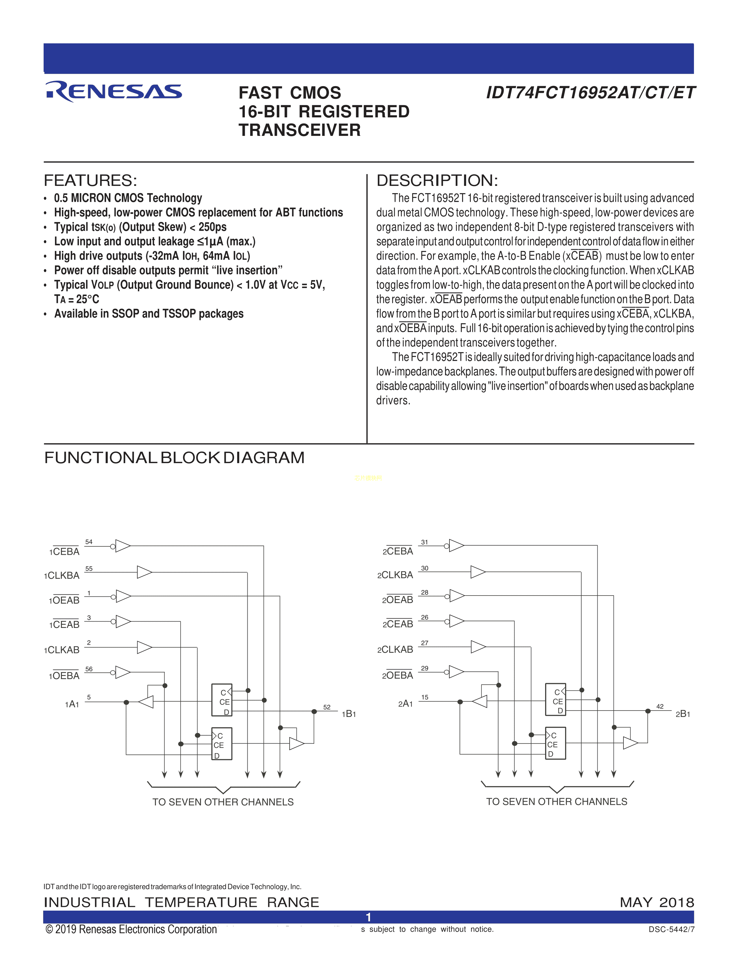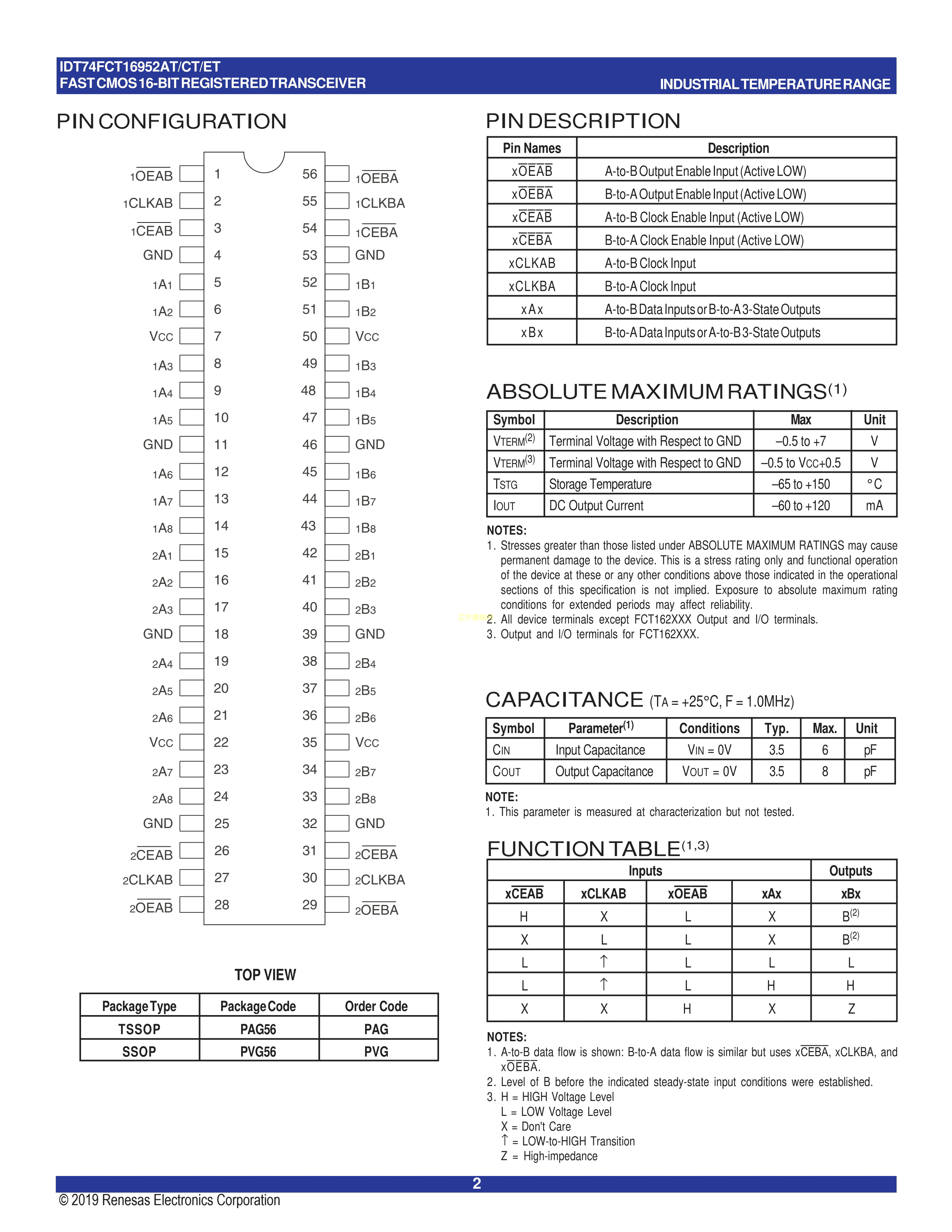 74FCT16952ATPVG数据手册SSOP-56封装RENESAS(瑞萨)-IDTPDF规格书,