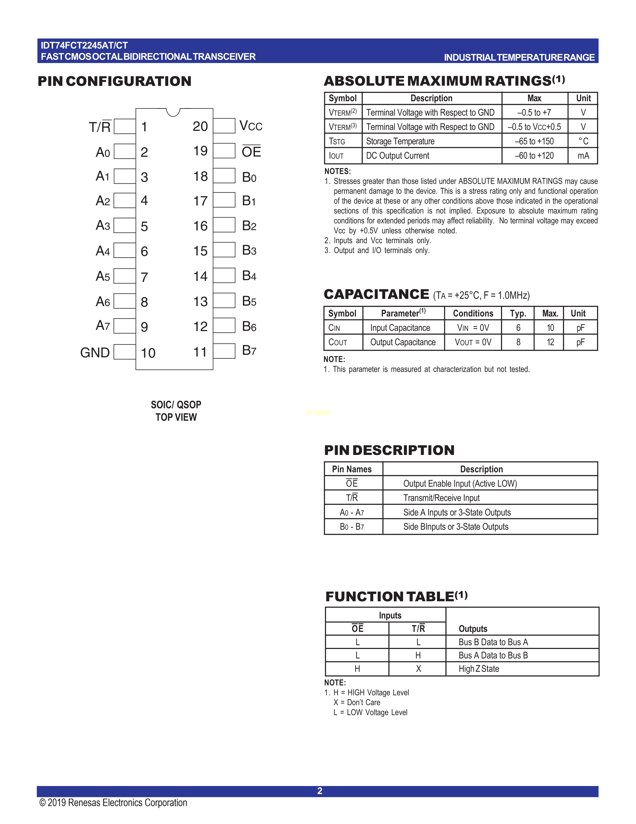 74FCT2245CTSOG数据手册SOIC-20封装RENESAS(瑞萨)-IDTPDF规格书,中