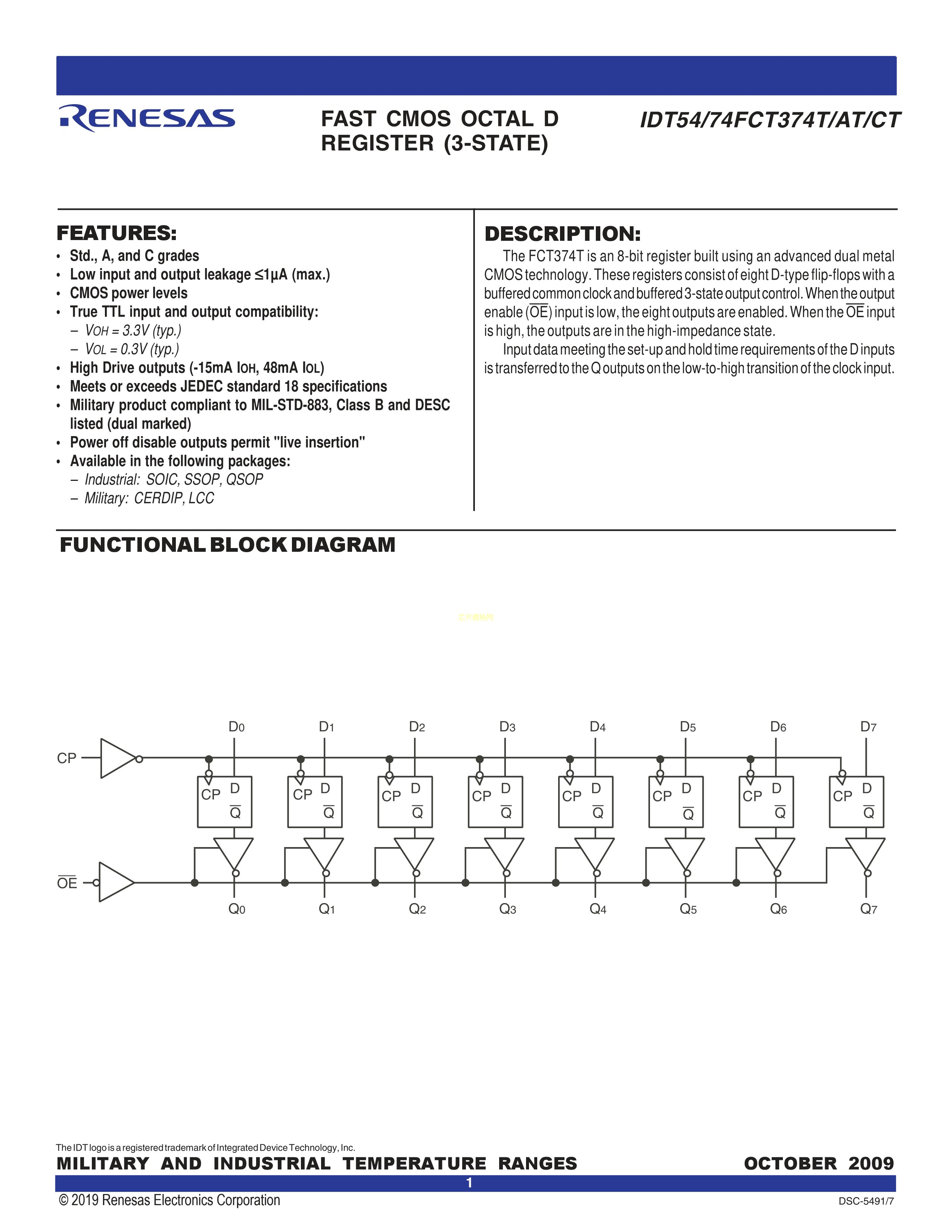 74FCT374CTSOG数据手册SOIC-20封装RENESAS(瑞萨)-IDTPDF规格书,中英