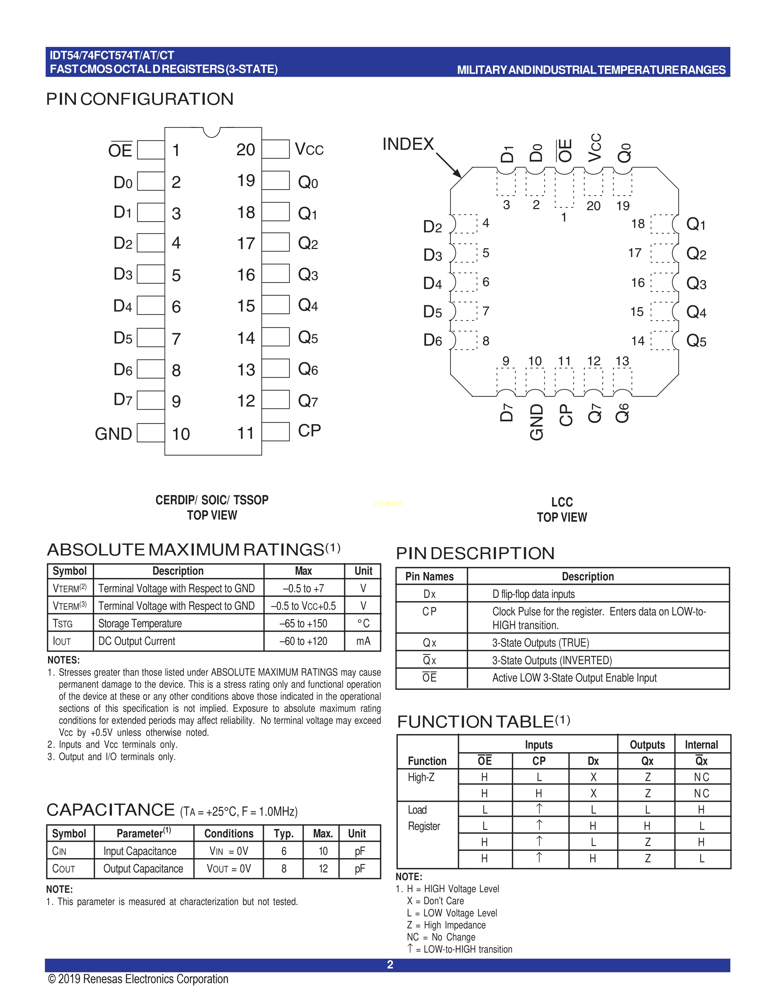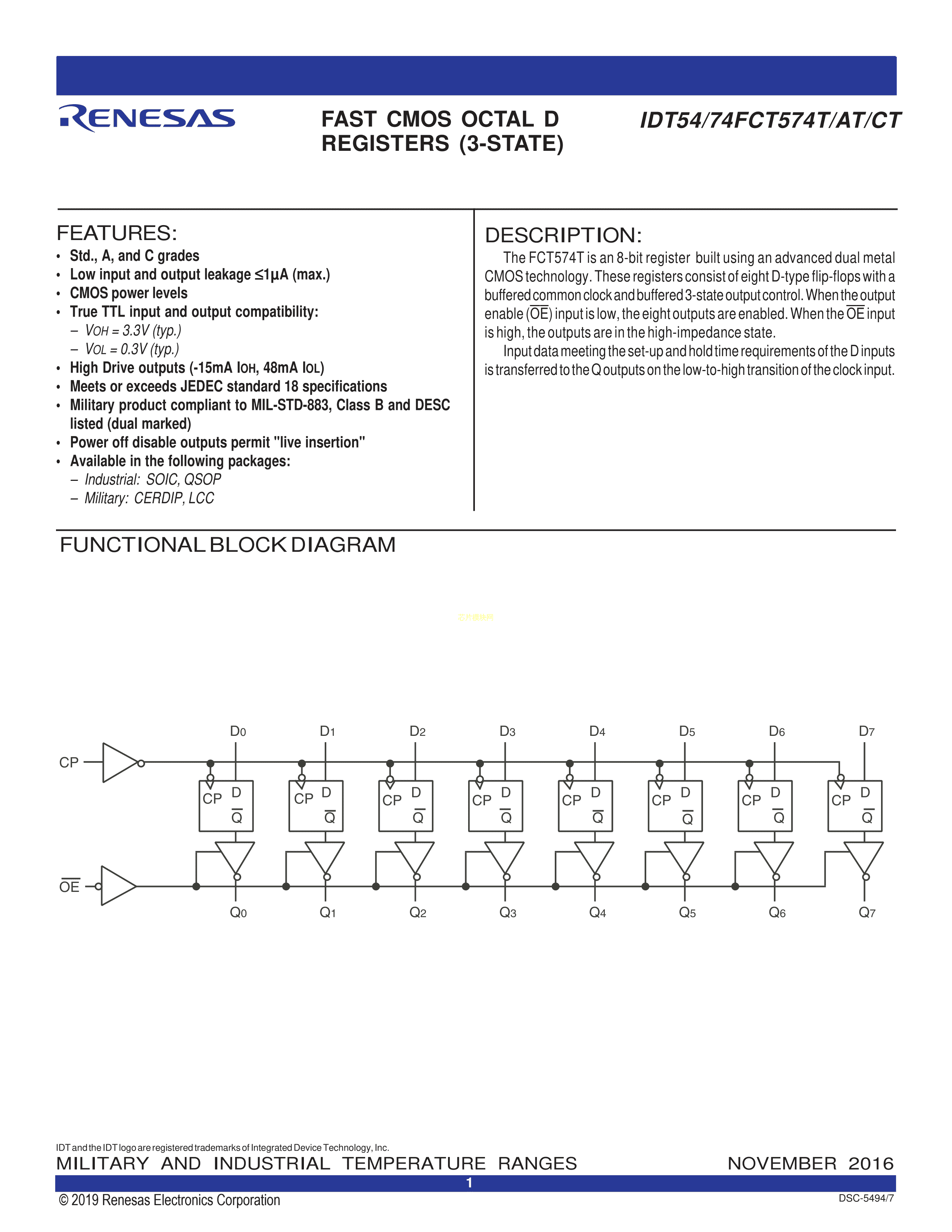 74FCT574CTQG数据手册QSOP-20封装RENESAS(瑞萨)-IDTPDF规格书,中英文