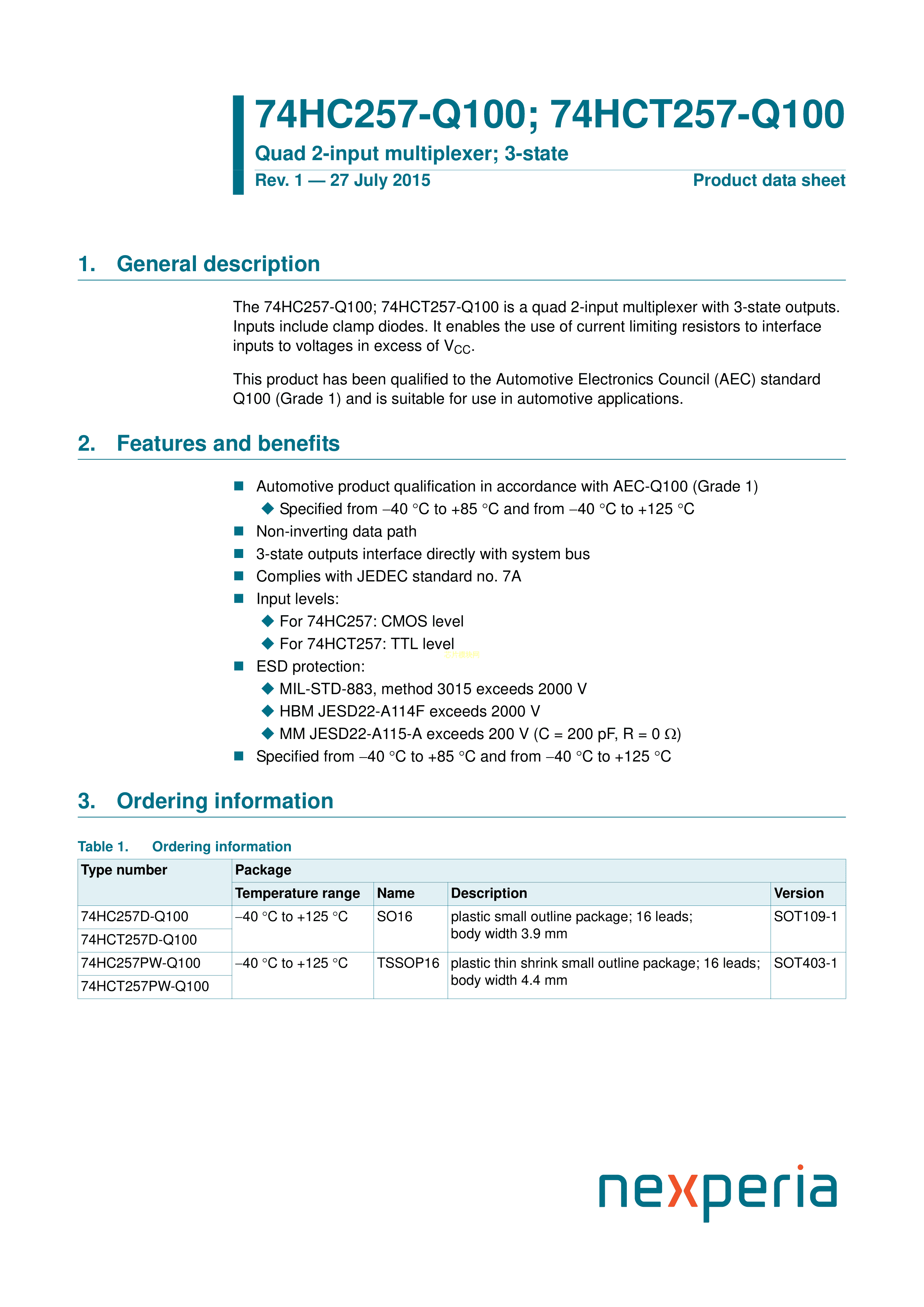 74HC257PW-Q100J数据手册TSSOP-16封装Nexperia(安世)PDF规格书,中英