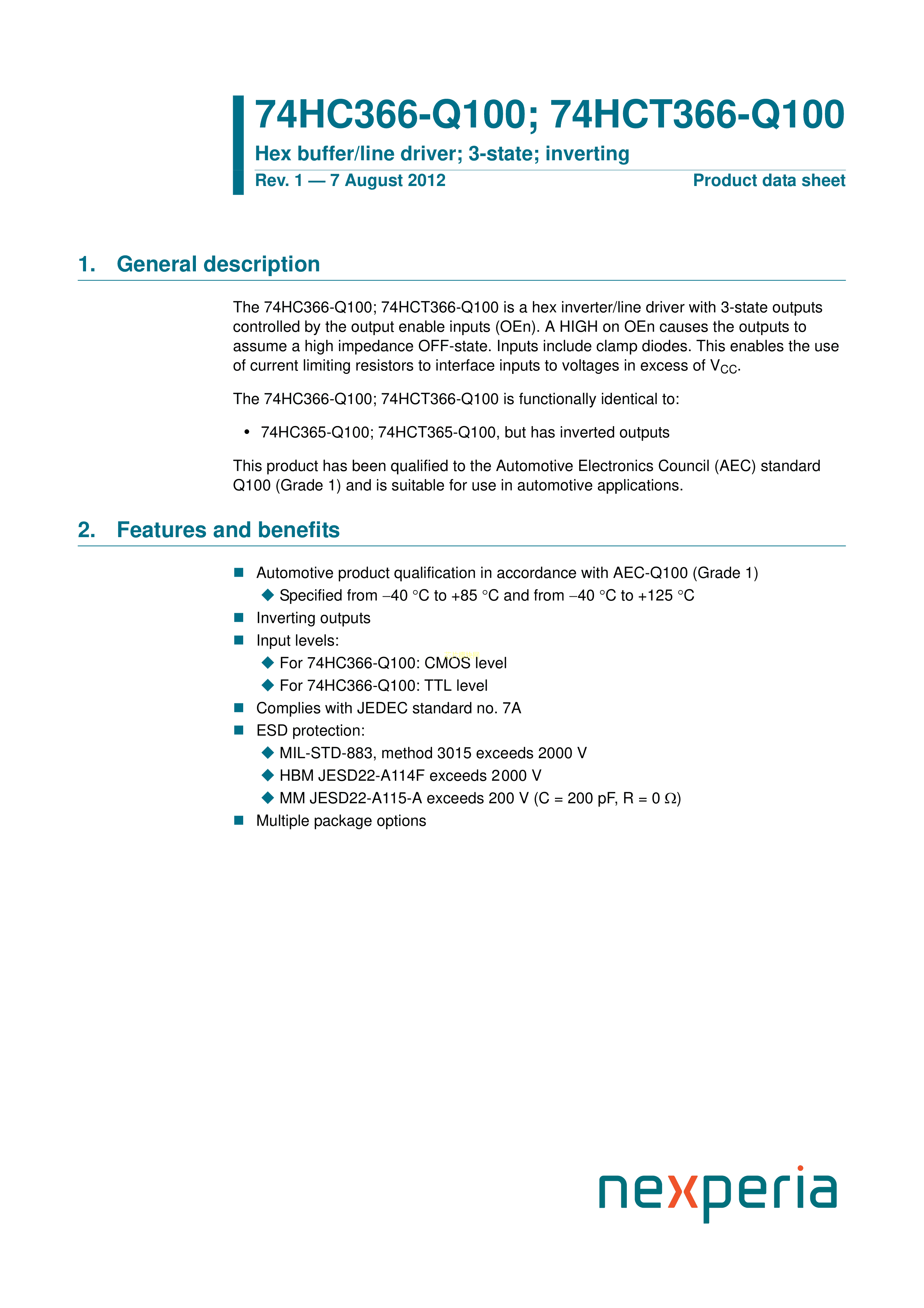 74HC366PW-Q100118数据手册TSSOP-16封装Nexperia(安世)PDF规格书,
