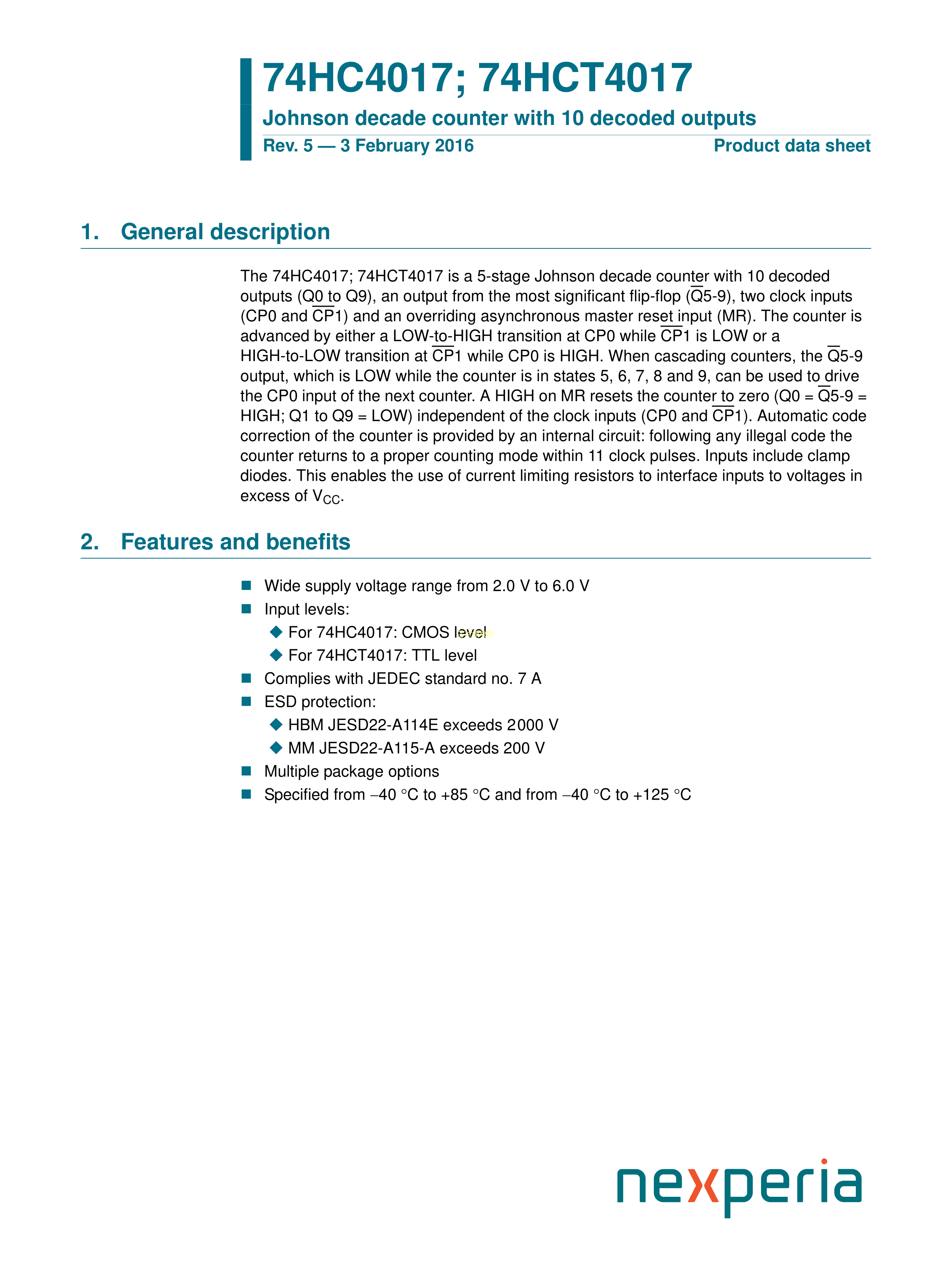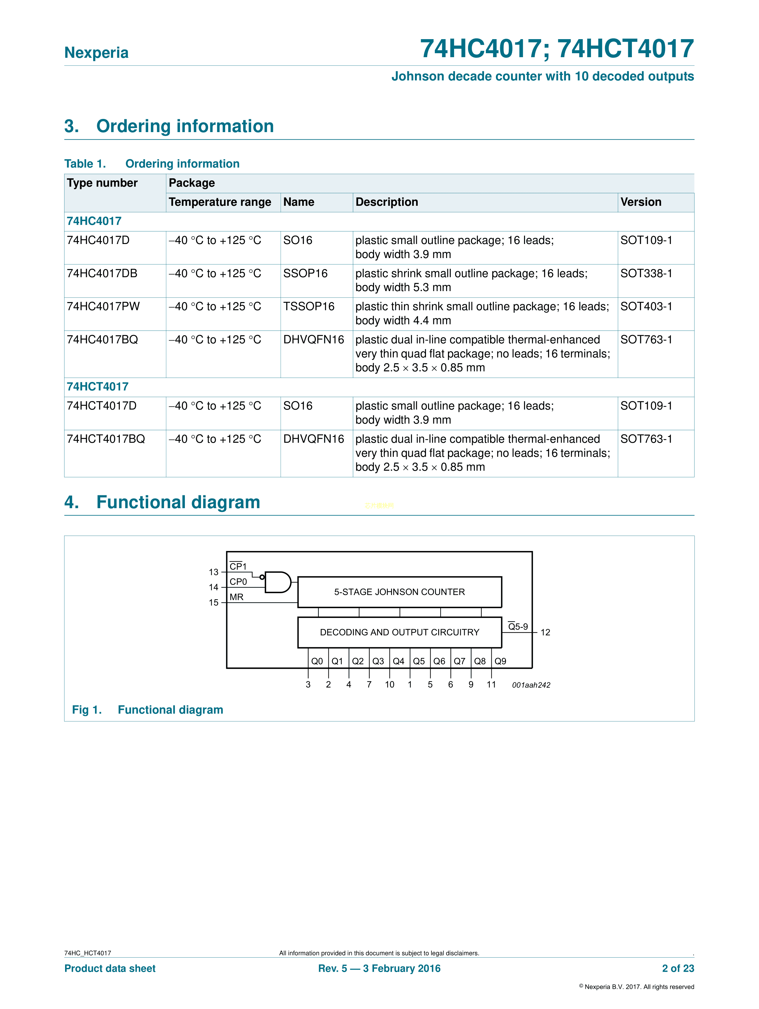 74HC4017BQ115数据手册DHVQFN-16封装Nexperia(安世)PDF规格书,中英文