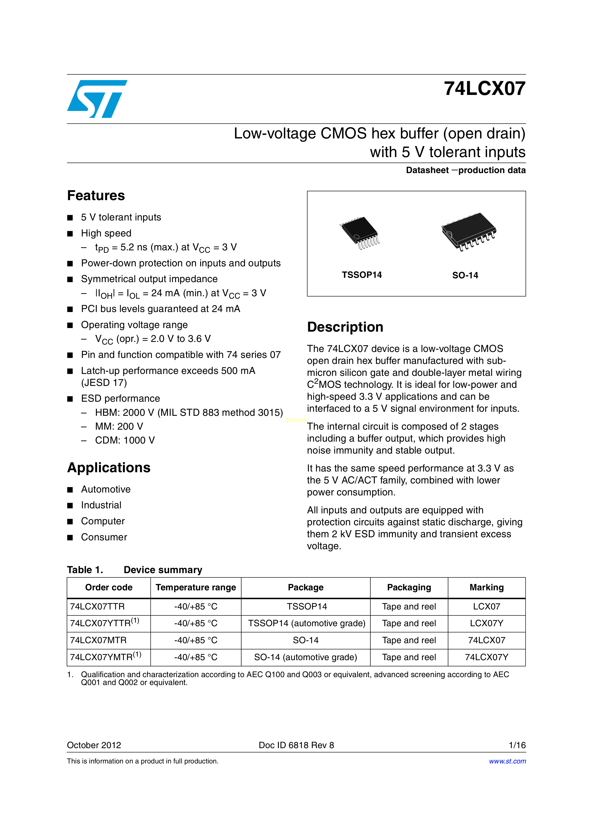 74LCX07YTTR数据手册TSSOP-14封装ST(意法半导体)PDF规格书,中英文下载