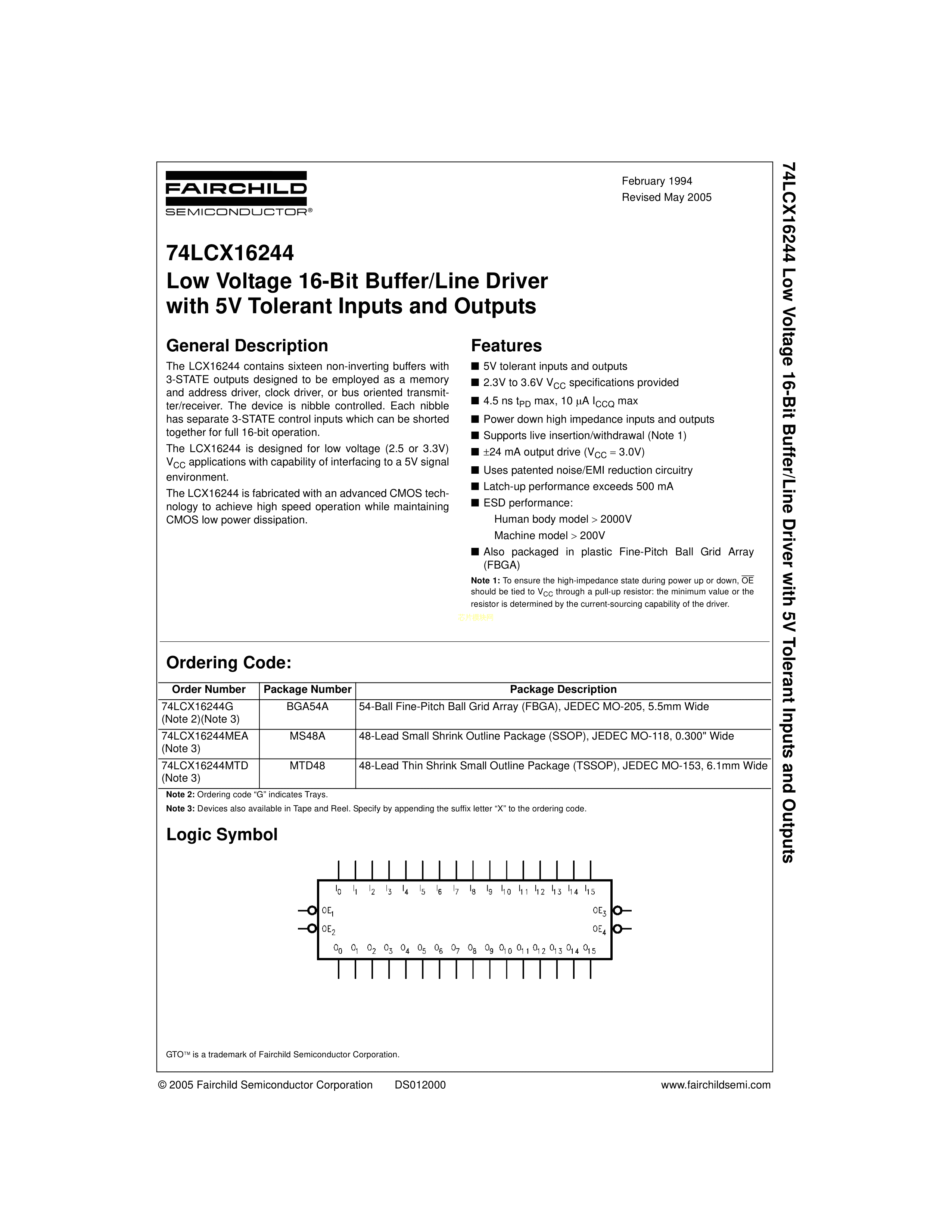 74LCX16244MTDX数据手册TSSOP-48封装onsemi(安森美)PDF规格书,中英文下