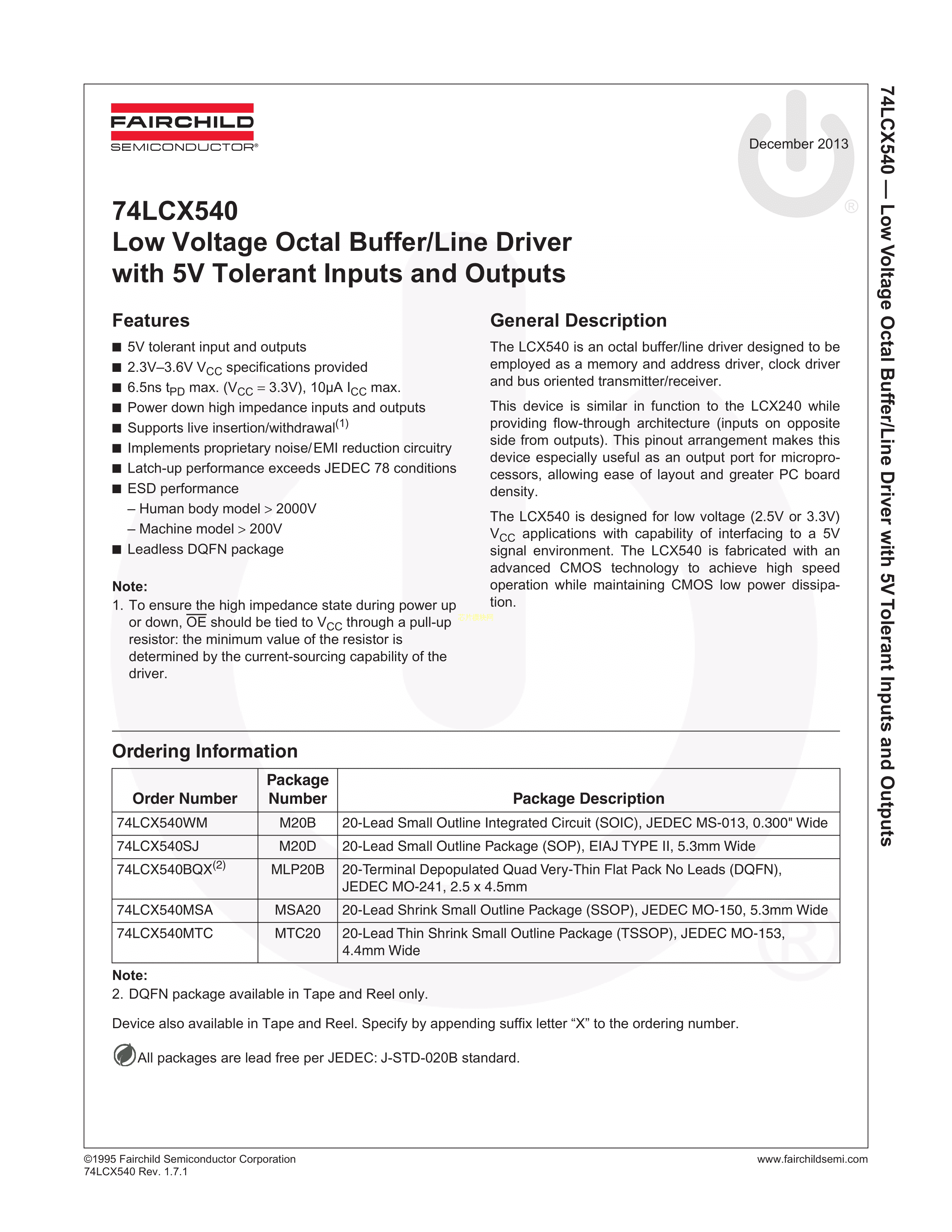 74LCX540MTCX数据手册TSSOP-20封装onsemi(安森美)PDF规格书,中英文下载
