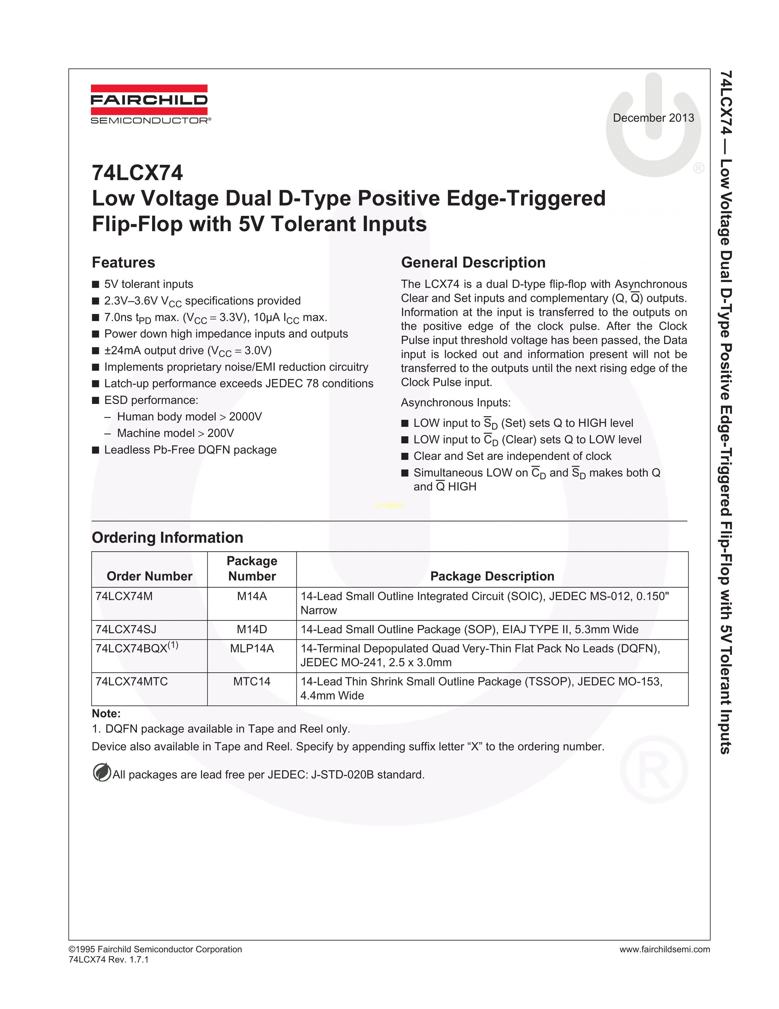 74LCX74MTC数据手册TSSOP-14封装onsemi(安森美)PDF规格书,中英文下载