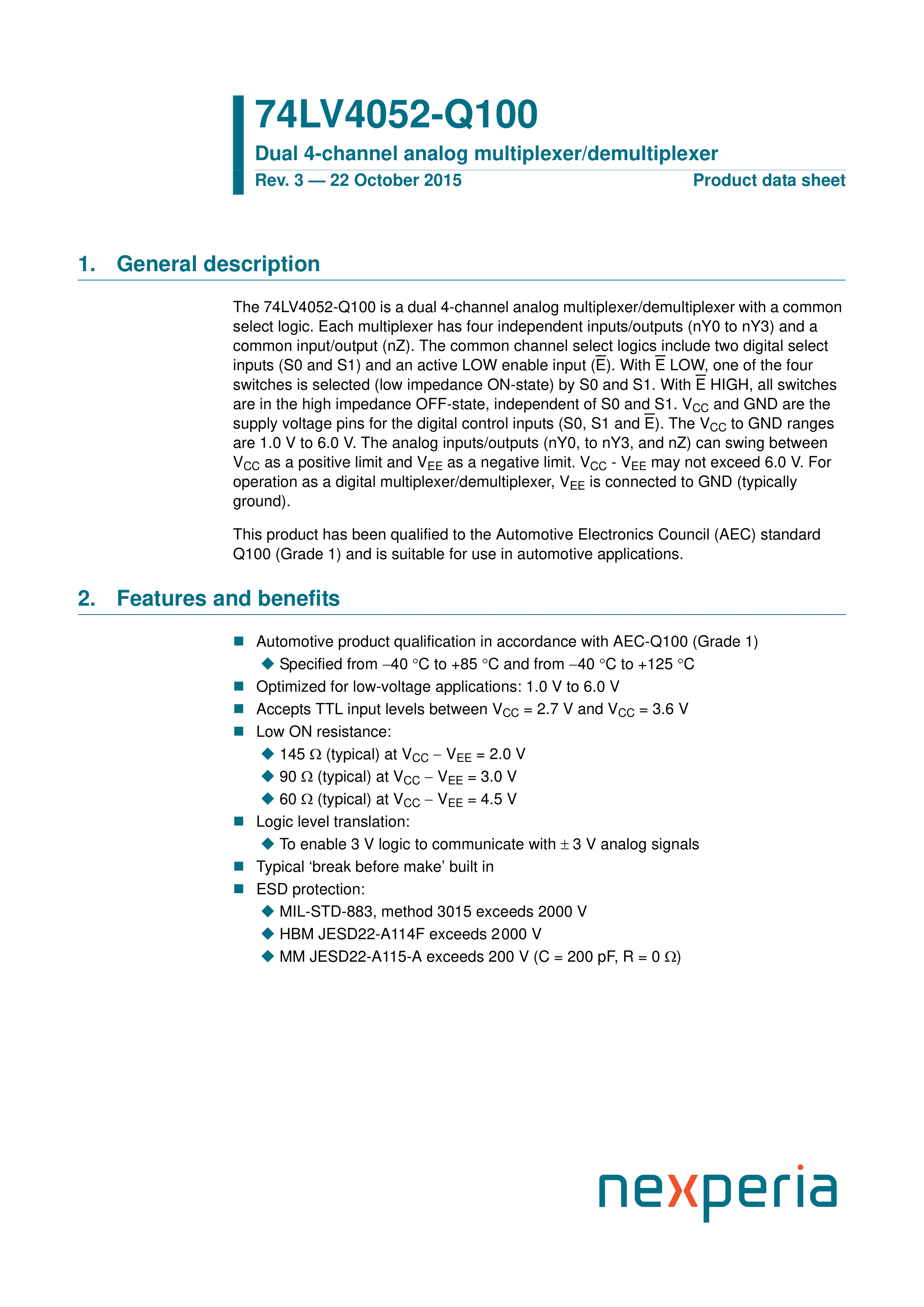 74LV4052PW-Q100J数据手册TSSOP-16封装Nexperia(安世)PDF规格书,中