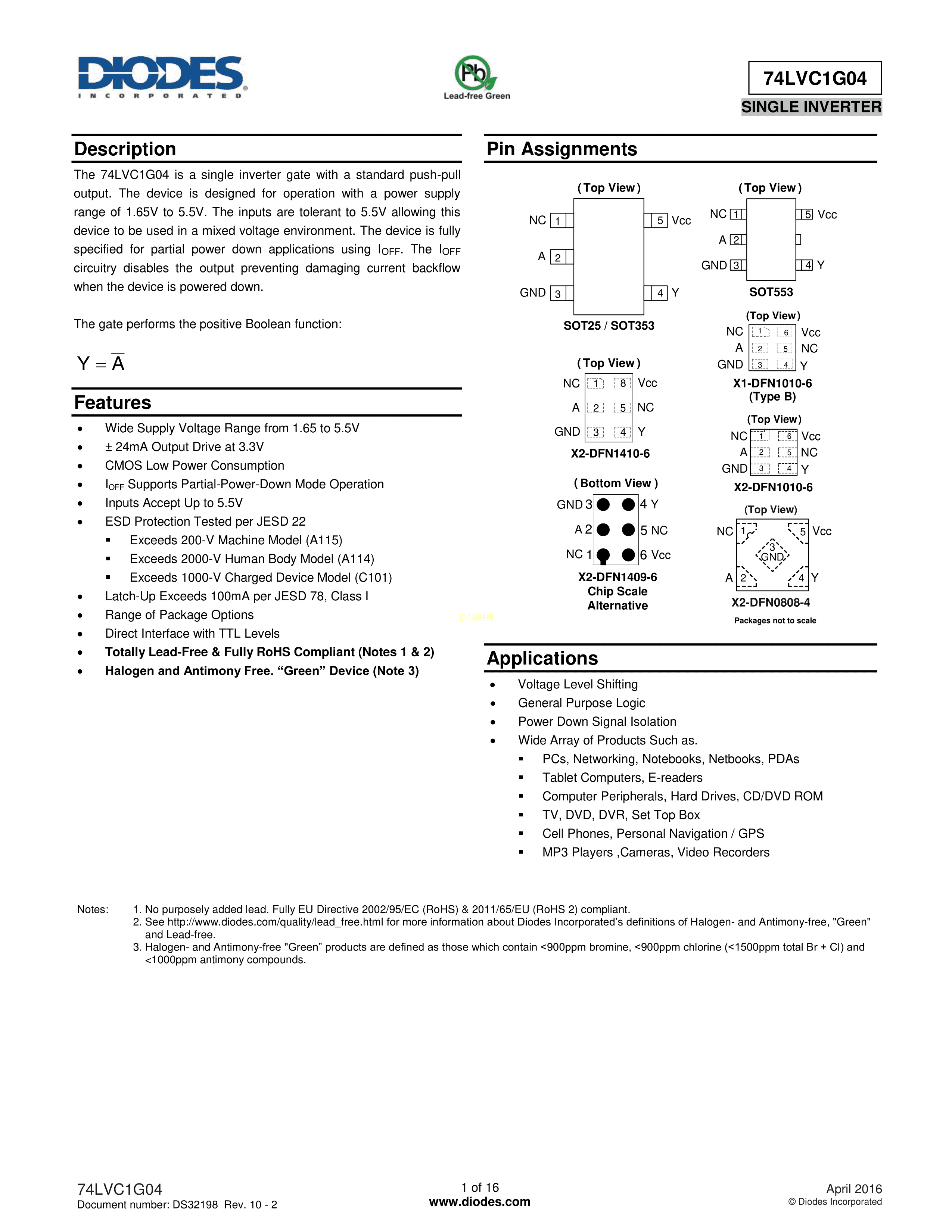 74LVC1G04W5-7数据手册SOT-25封装DIODES(美台)PDF规格书,中英文下载