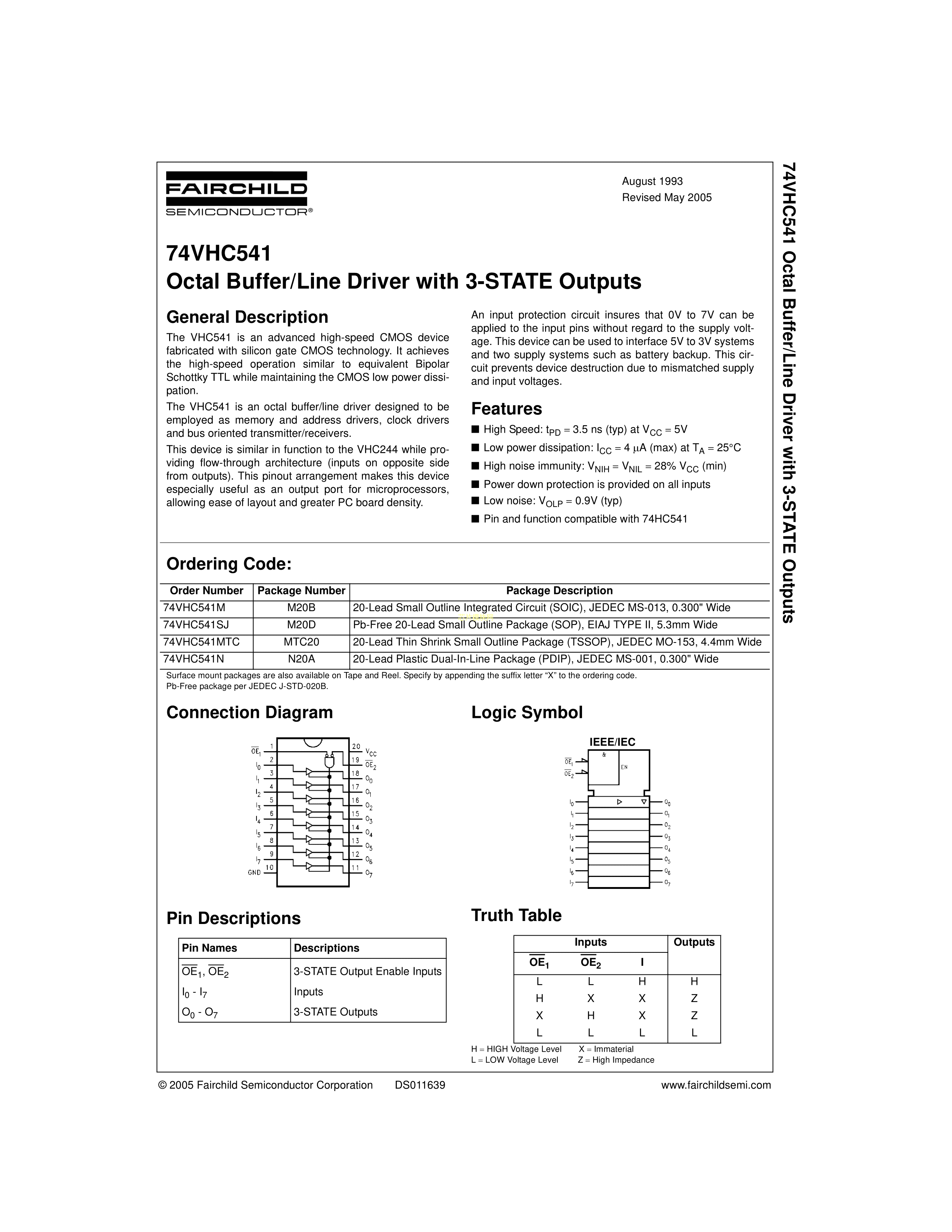 74VHC541MX数据手册SOIC-20封装onsemi(安森美)PDF规格书,中英文下载