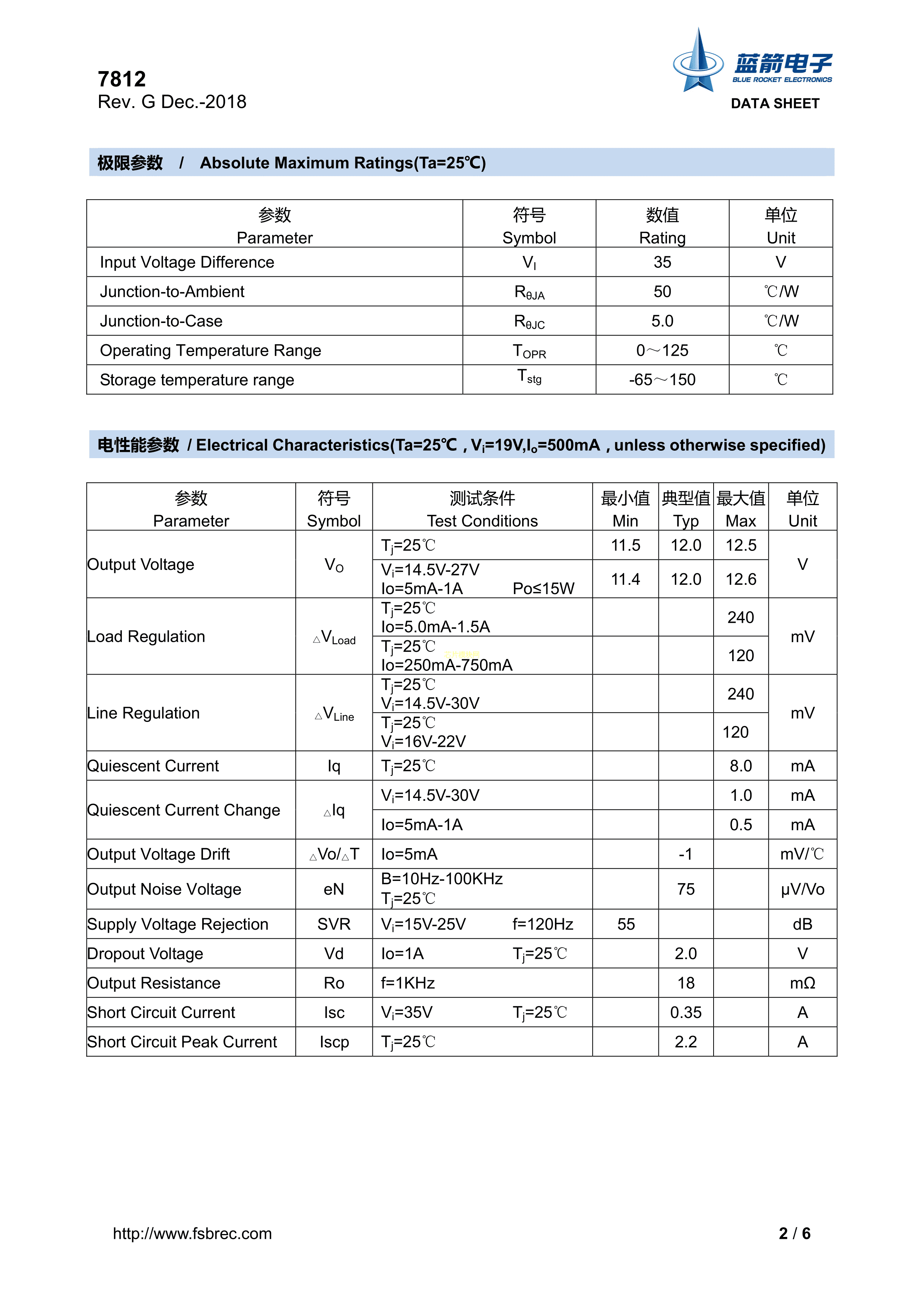 7812数据手册TO-220封装BLUE ROCKET(蓝箭)PDF规格书,中英文下载