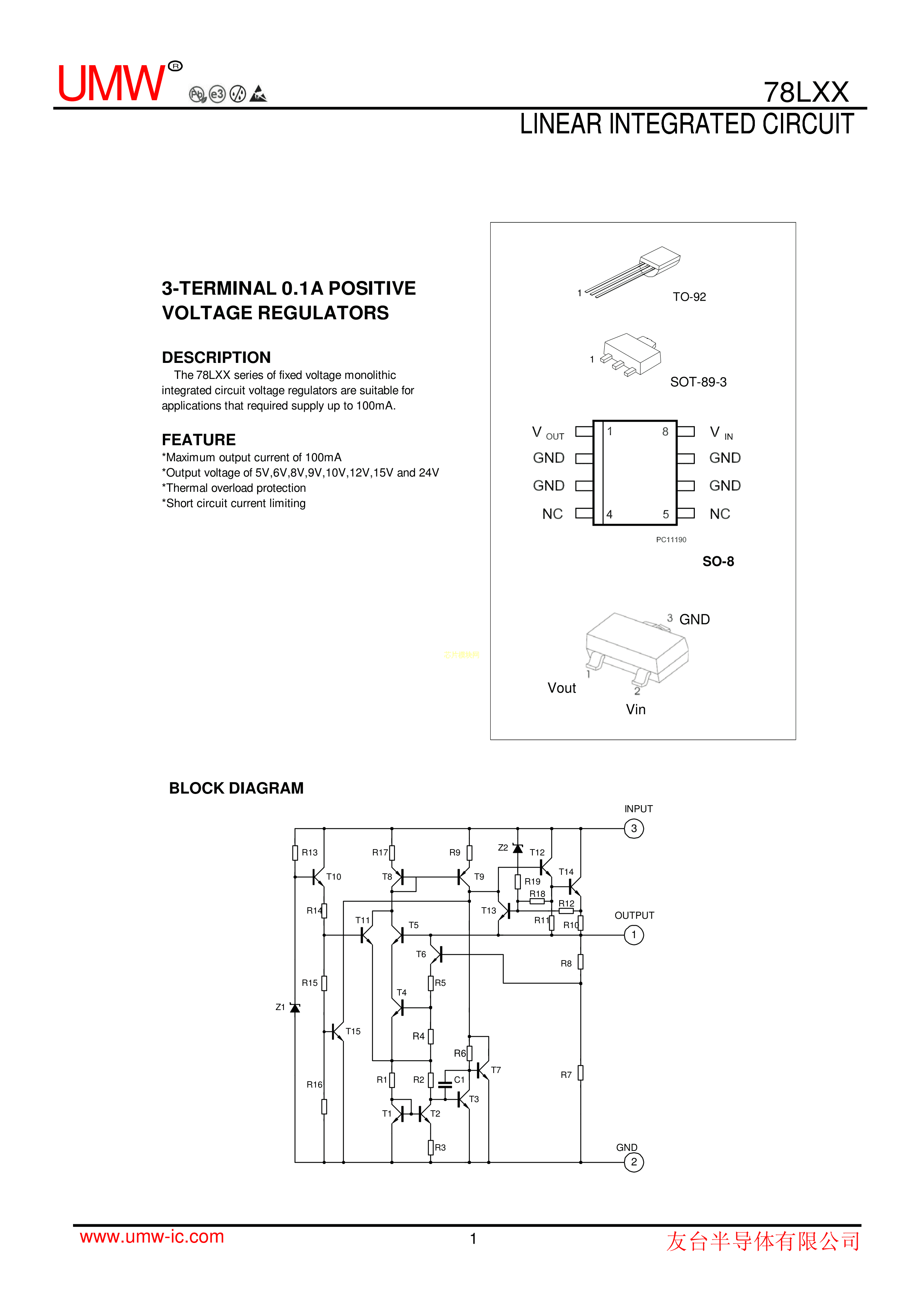 78L05数据手册SOT-89封装UMW(友台半导体)PDF规格书,中英文下载