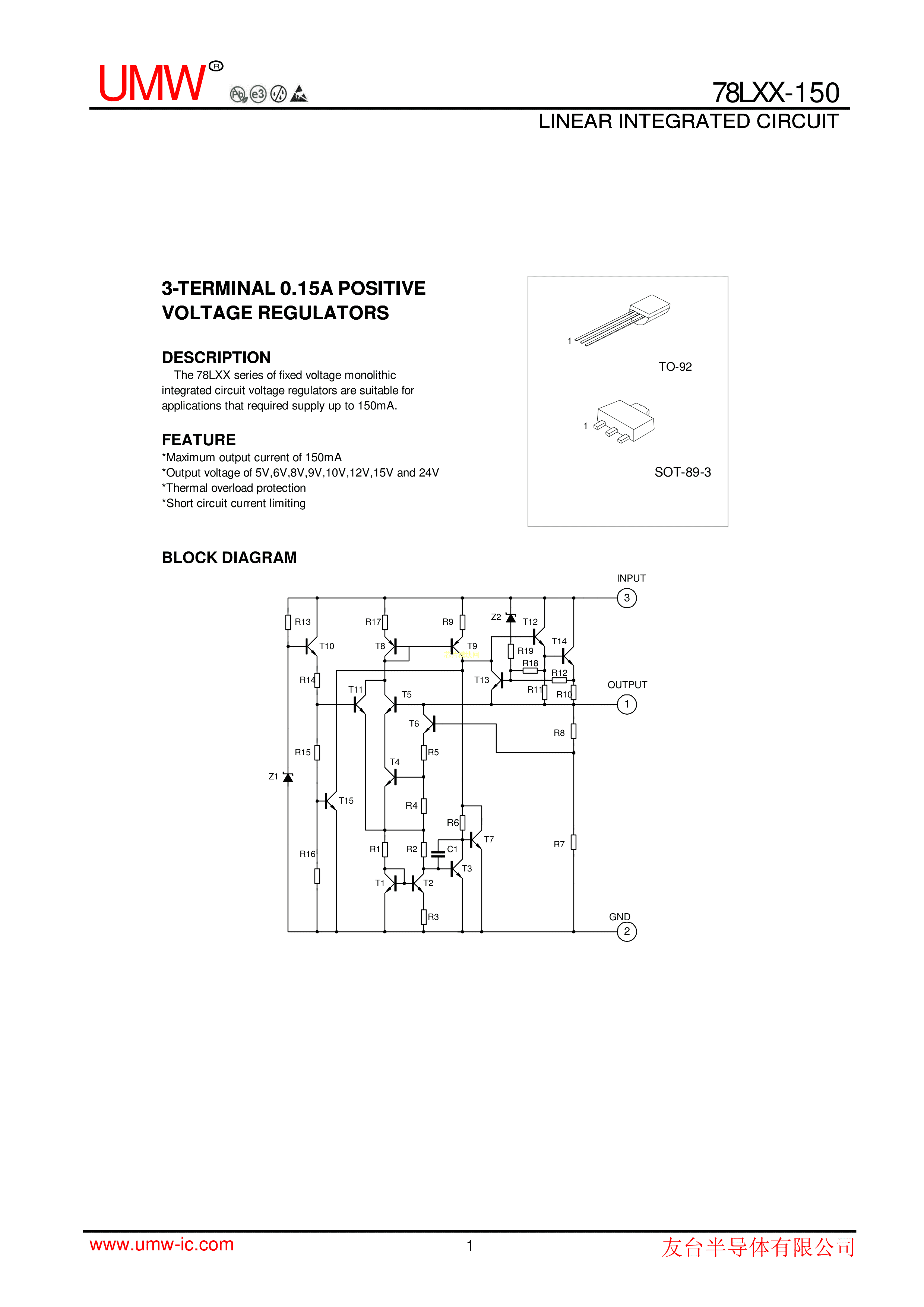 78L08-150数据手册SOT-89封装UMW(友台半导体)PDF规格书,中英文下载