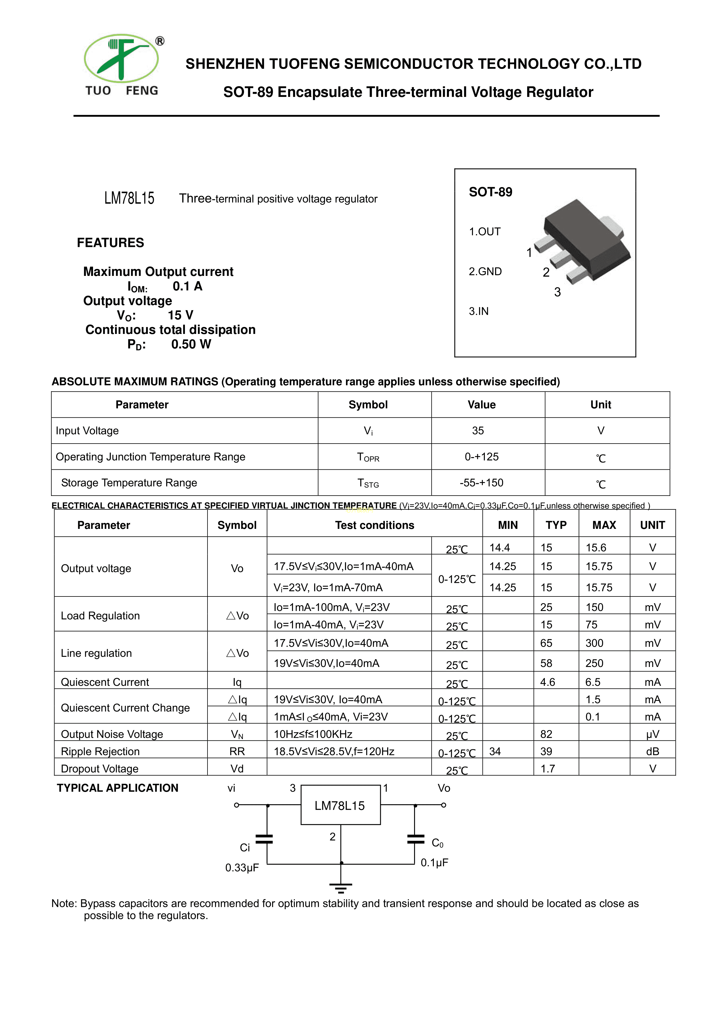 78L15数据手册SOT-89封装TF(拓锋)PDF规格书,中英文下载