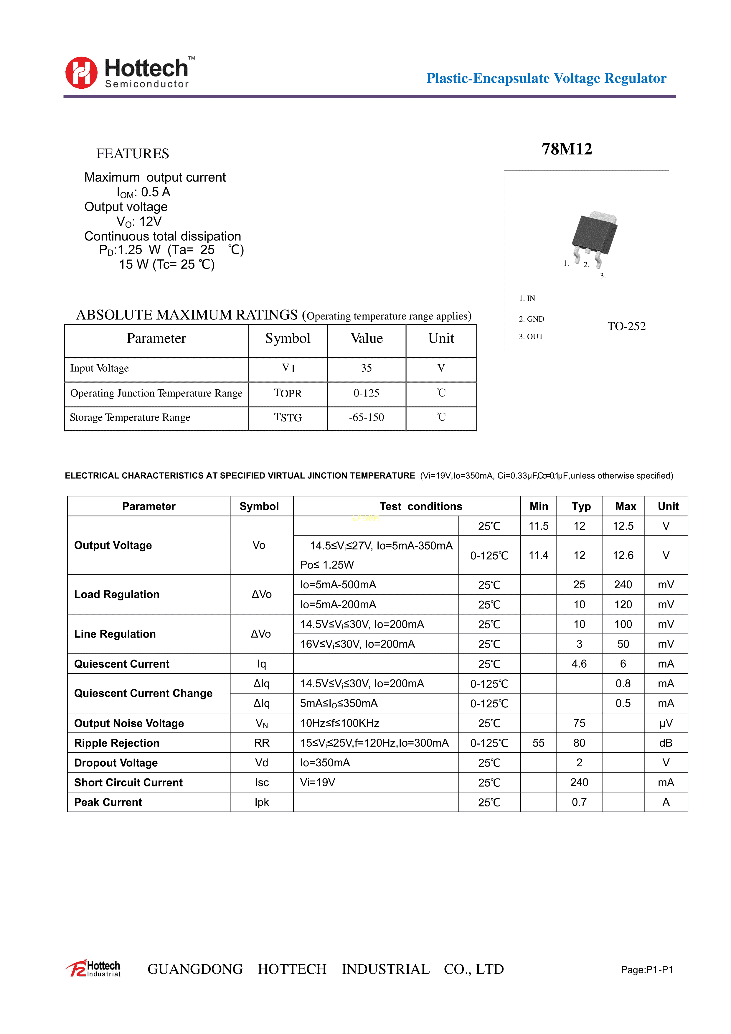 78M12数据手册TO-252-2(DPAK)封装Hottech(合科泰)PDF规格书,中英文下载