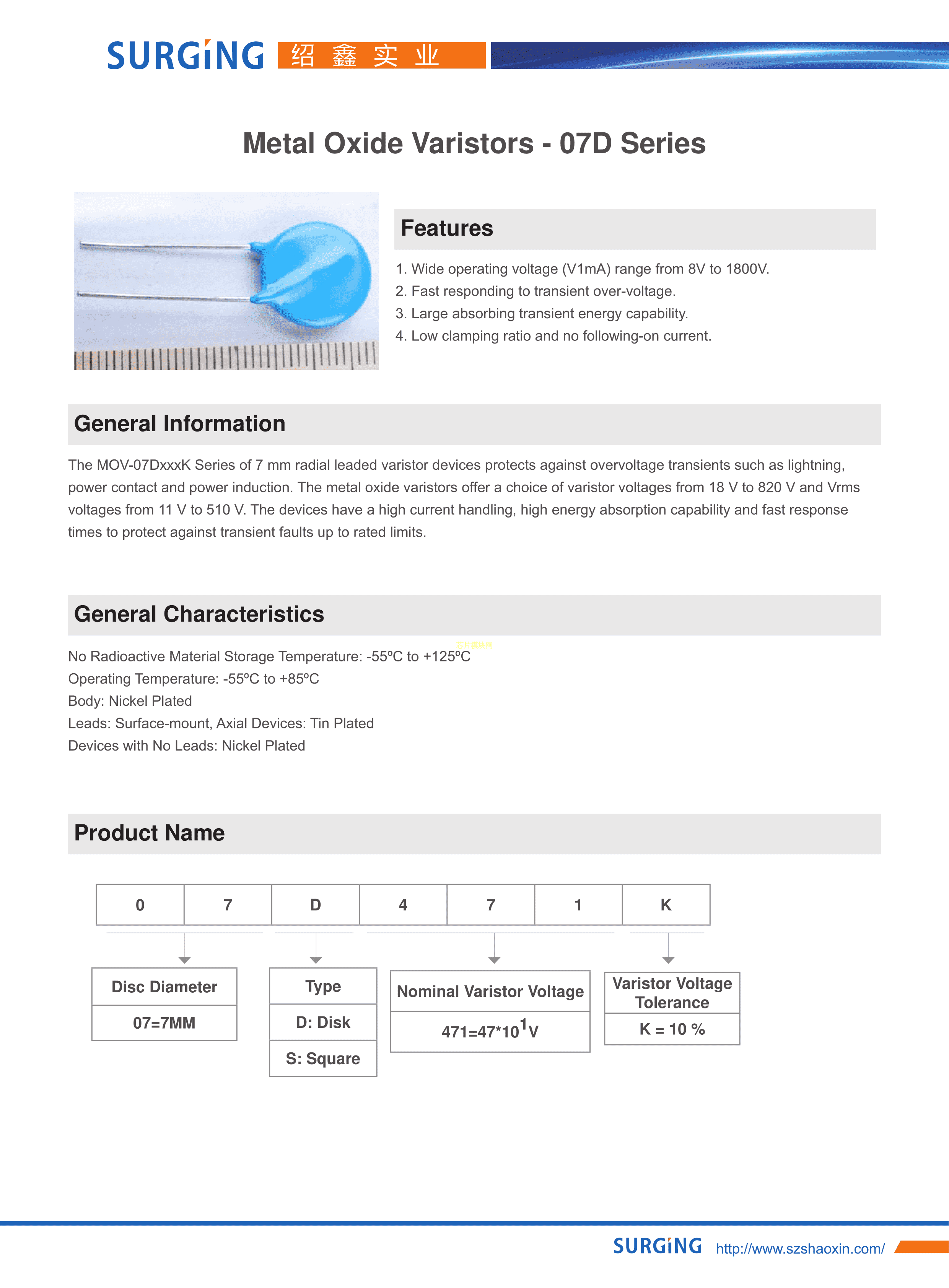 7D471KJ数据手册径向引线P5mm封装SURGING(绍鑫)PDF规格书,中英文下载