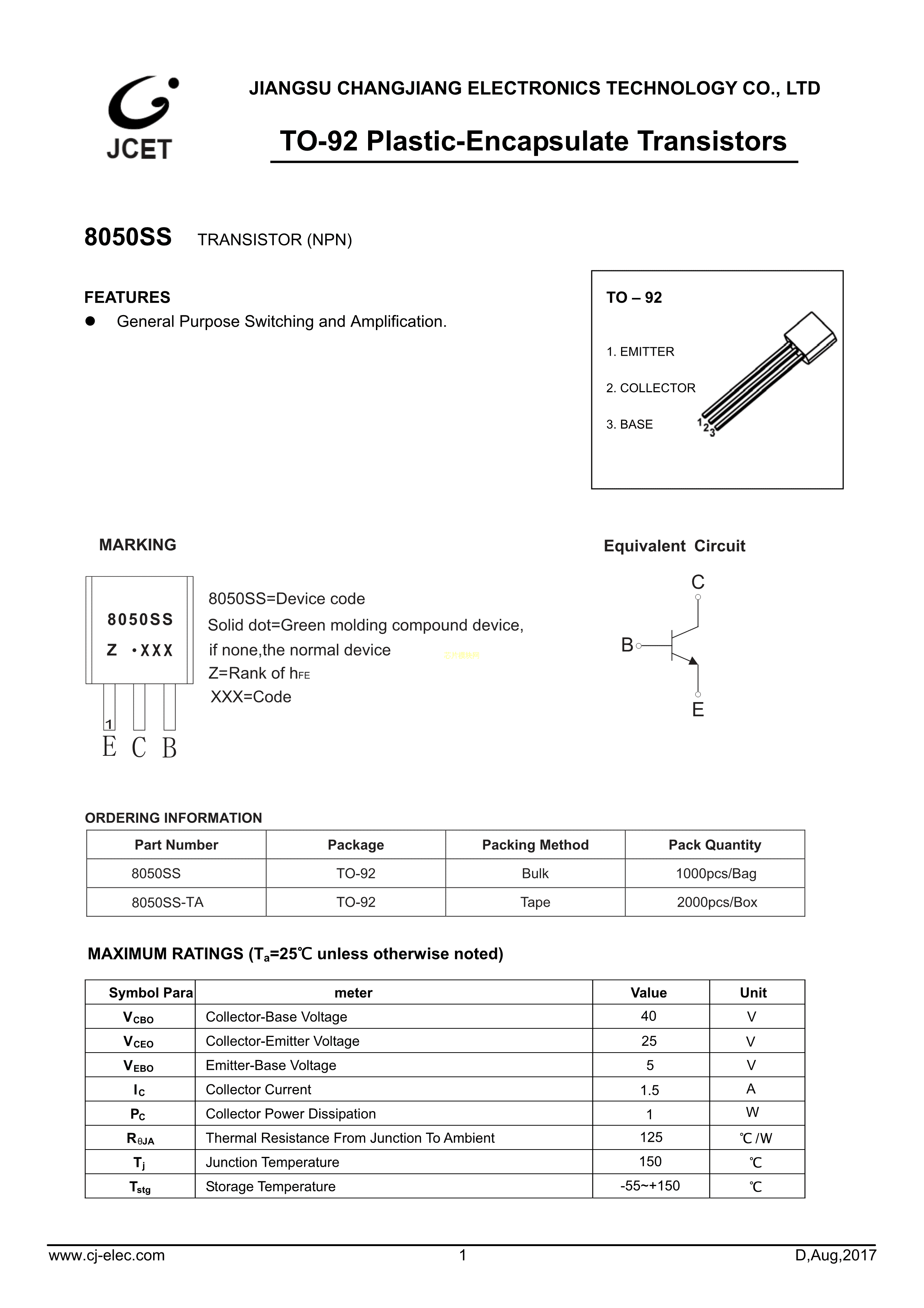 8050SS数据手册TO-92(TO-92-3)封装CJ(江苏长电-长晶)PDF规格书,中英文下载