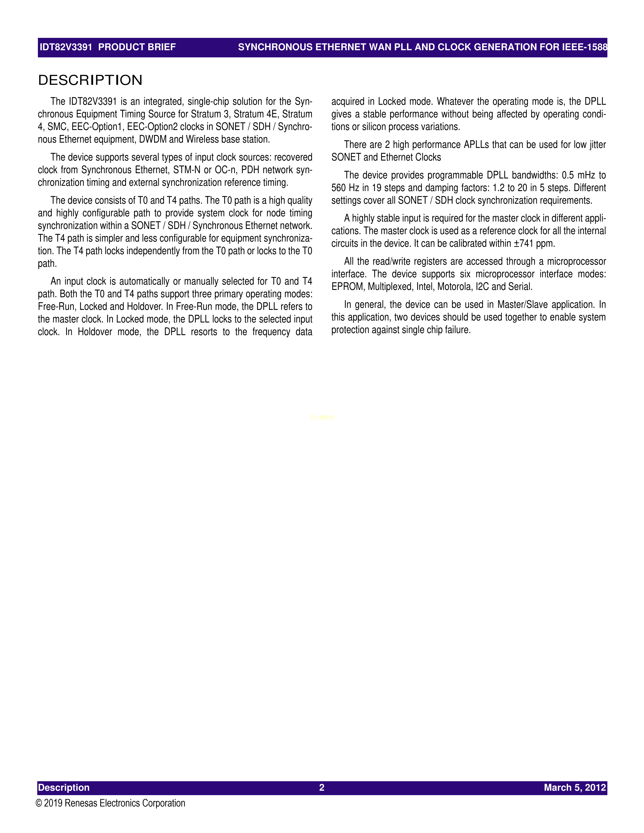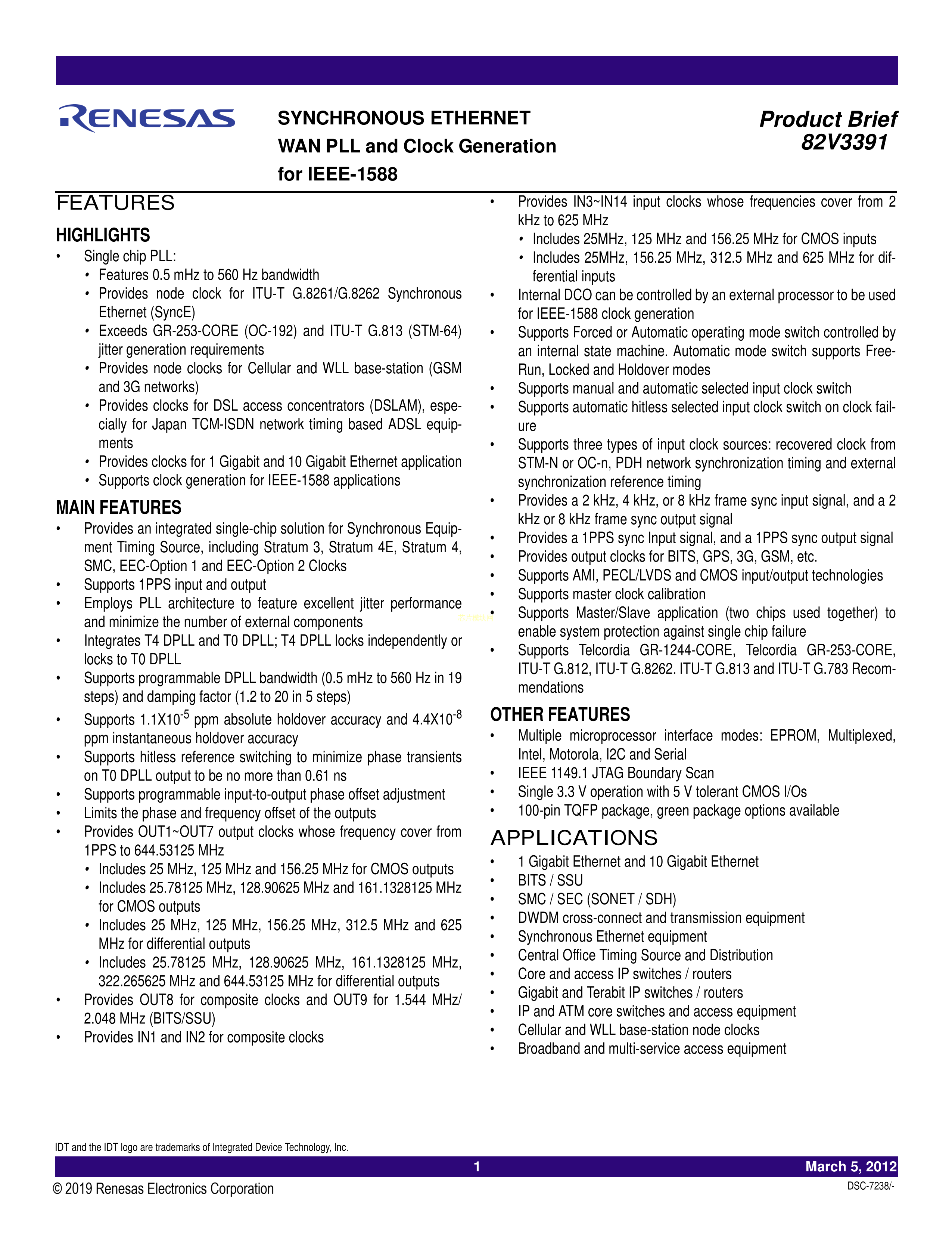 82V3391BEQG8数据手册TQFP-100_EP(14x14)封装RENESAS(瑞萨)-ID