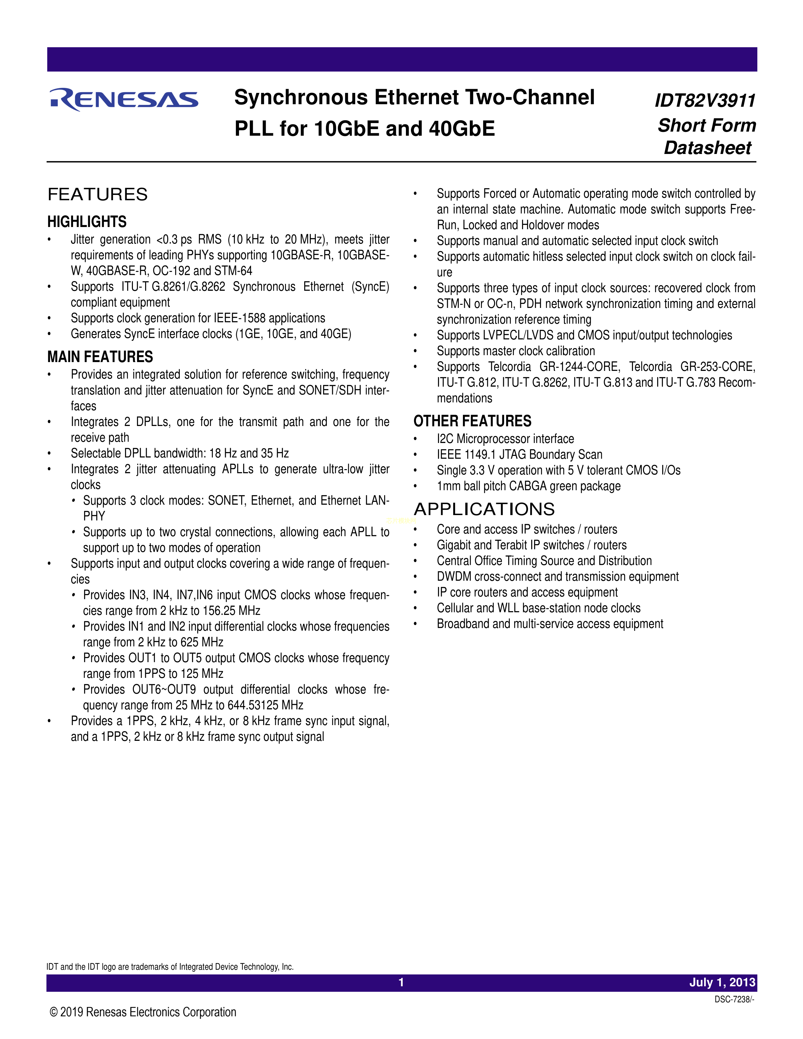 82V3911AUG8数据手册CABGA-196(15x15)封装RENESAS(瑞萨)-IDTPD