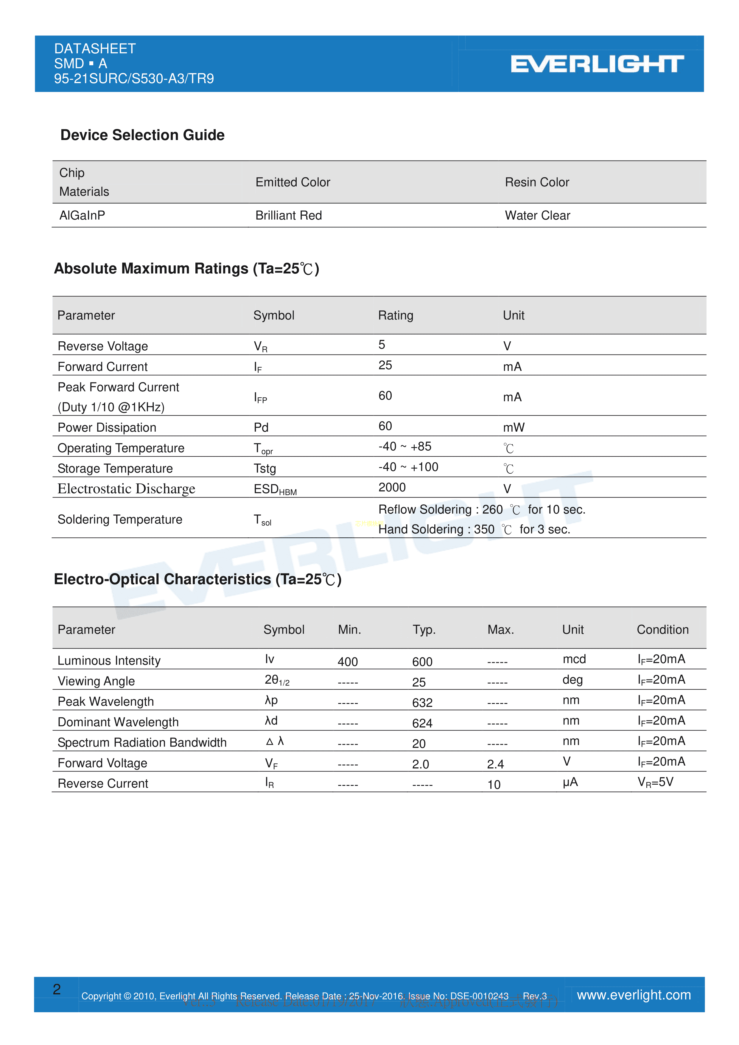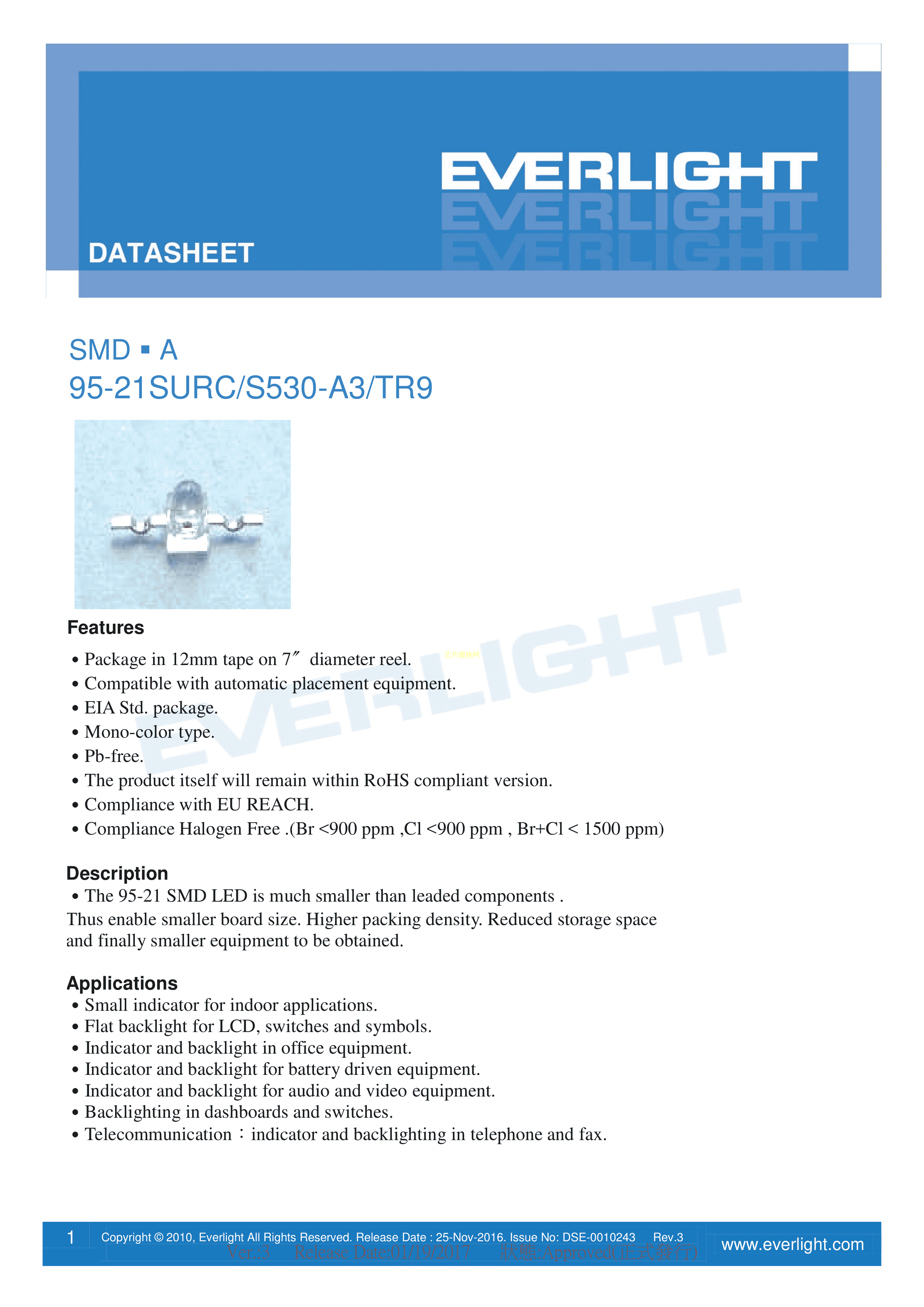 95-21SURC-S530-A3-TR9数据手册SMD2.1x2x2.7mm封装EVERLIGHT