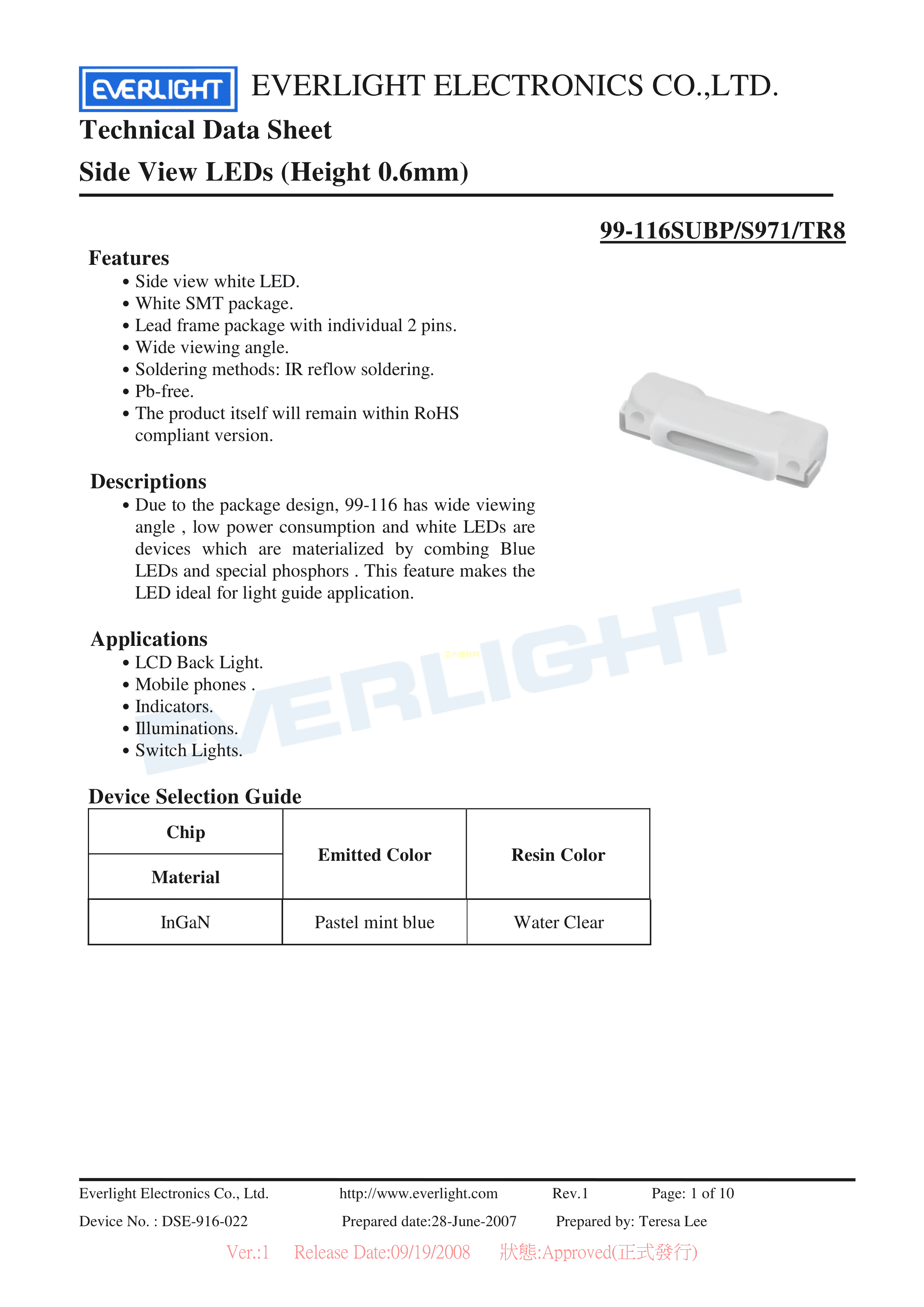 99-116SUBP-S971-TR8数据手册SMD封装EVERLIGHT(台湾亿光)PDF规格书,