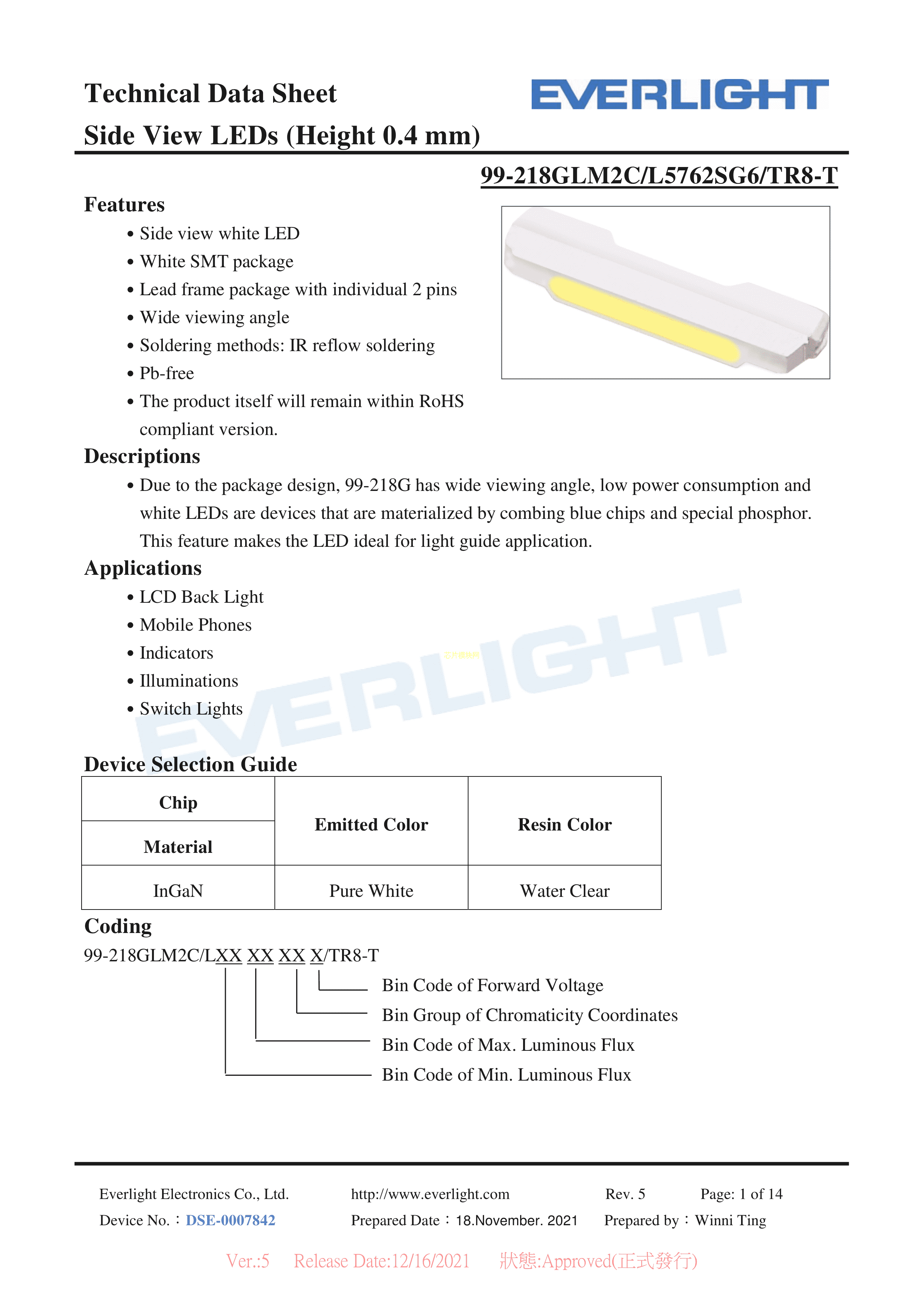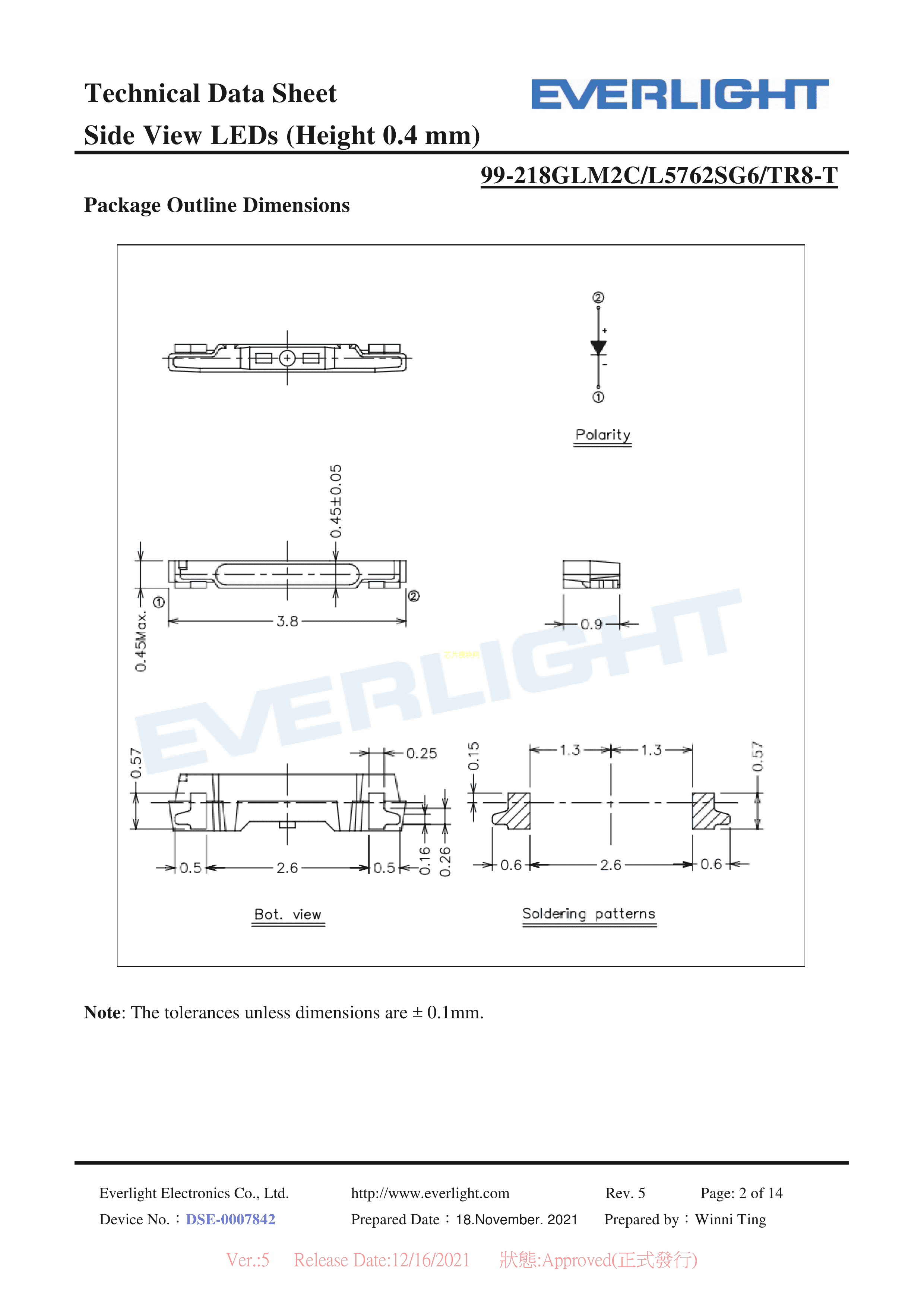 99-218GLM2C-L5762SG6-TR8-T数据手册SMD3.8x0.9x0.45mm封装E