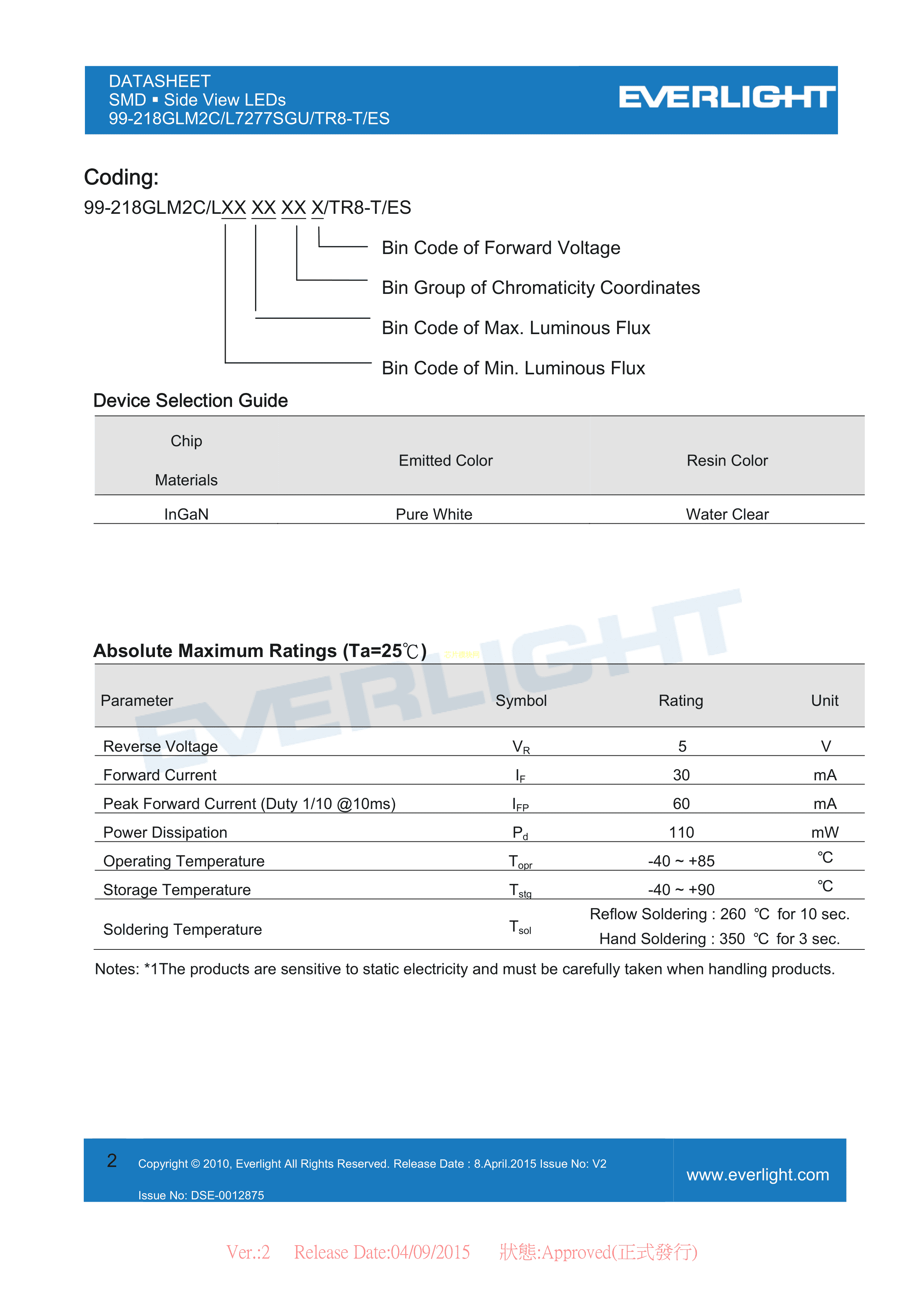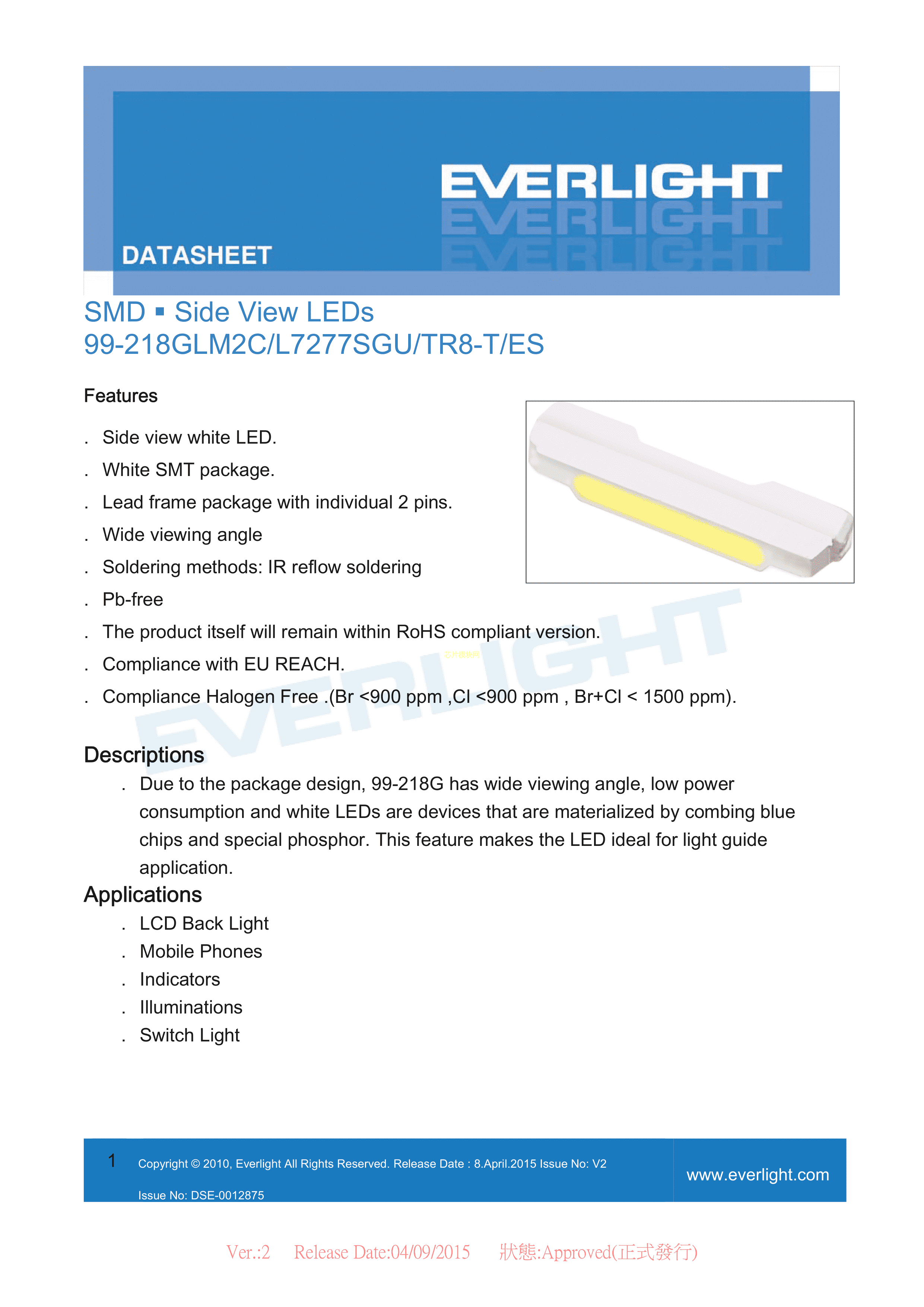 99-218GLM2C-L7277SGU-TR8-T-ES数据手册SMD封装EVERLIGHT(台湾