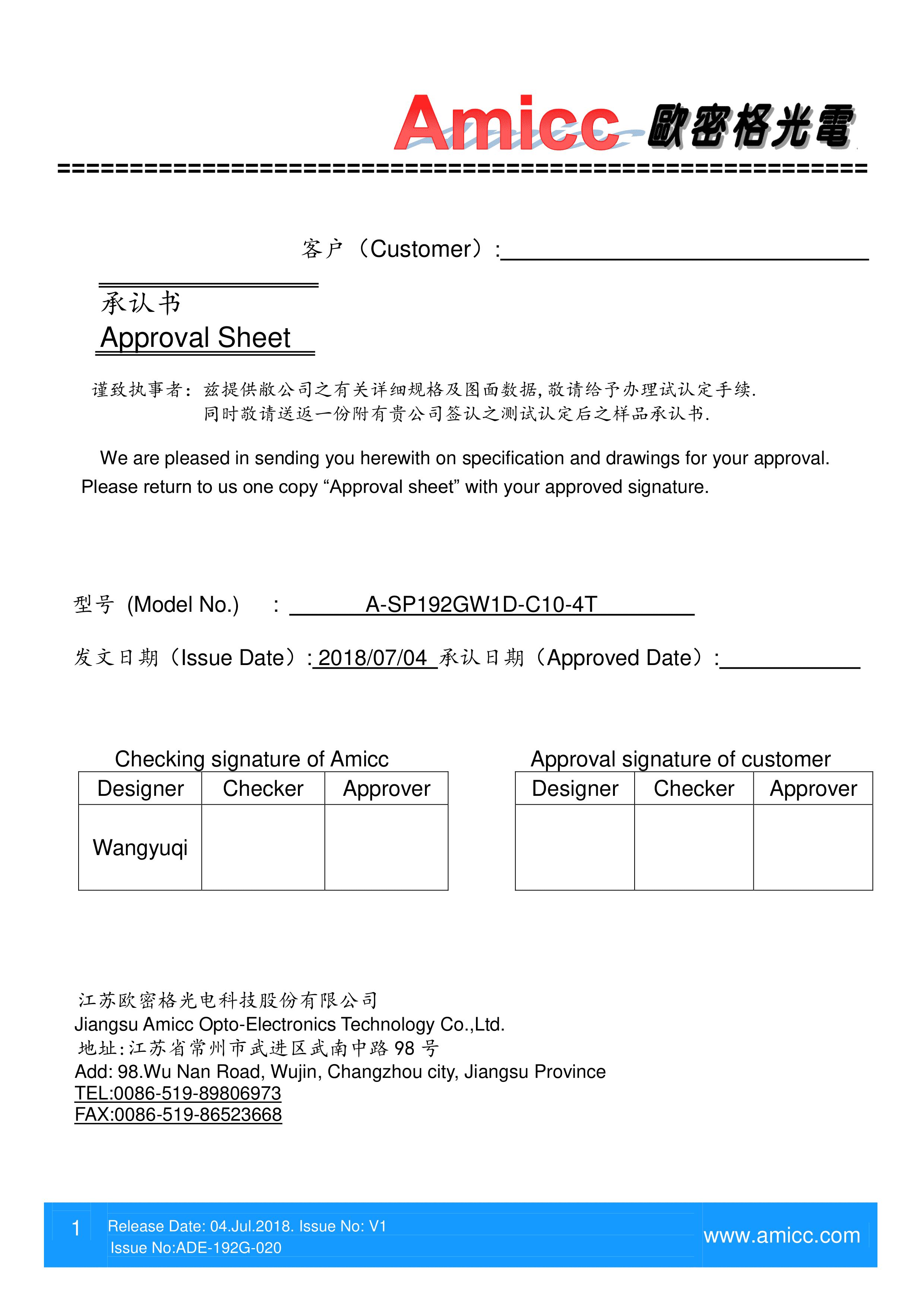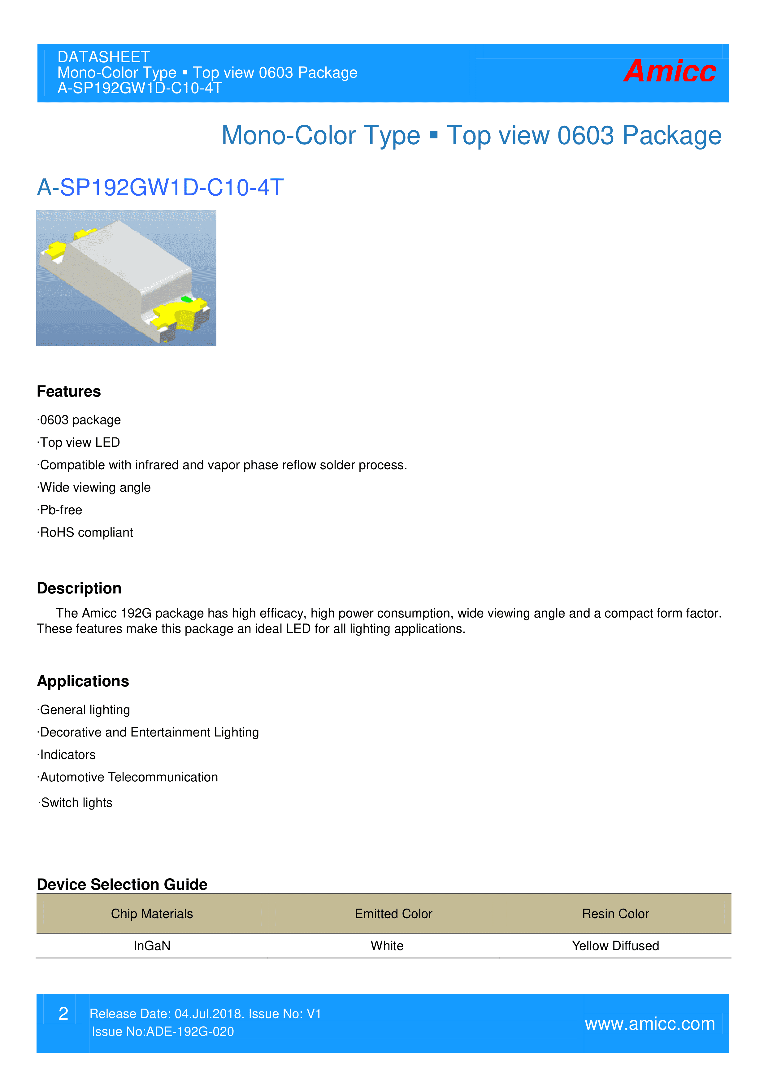 A-SP192GW1D-C10-4T数据手册0603封装Amicc(欧密格光电)PDF规格书,中英文