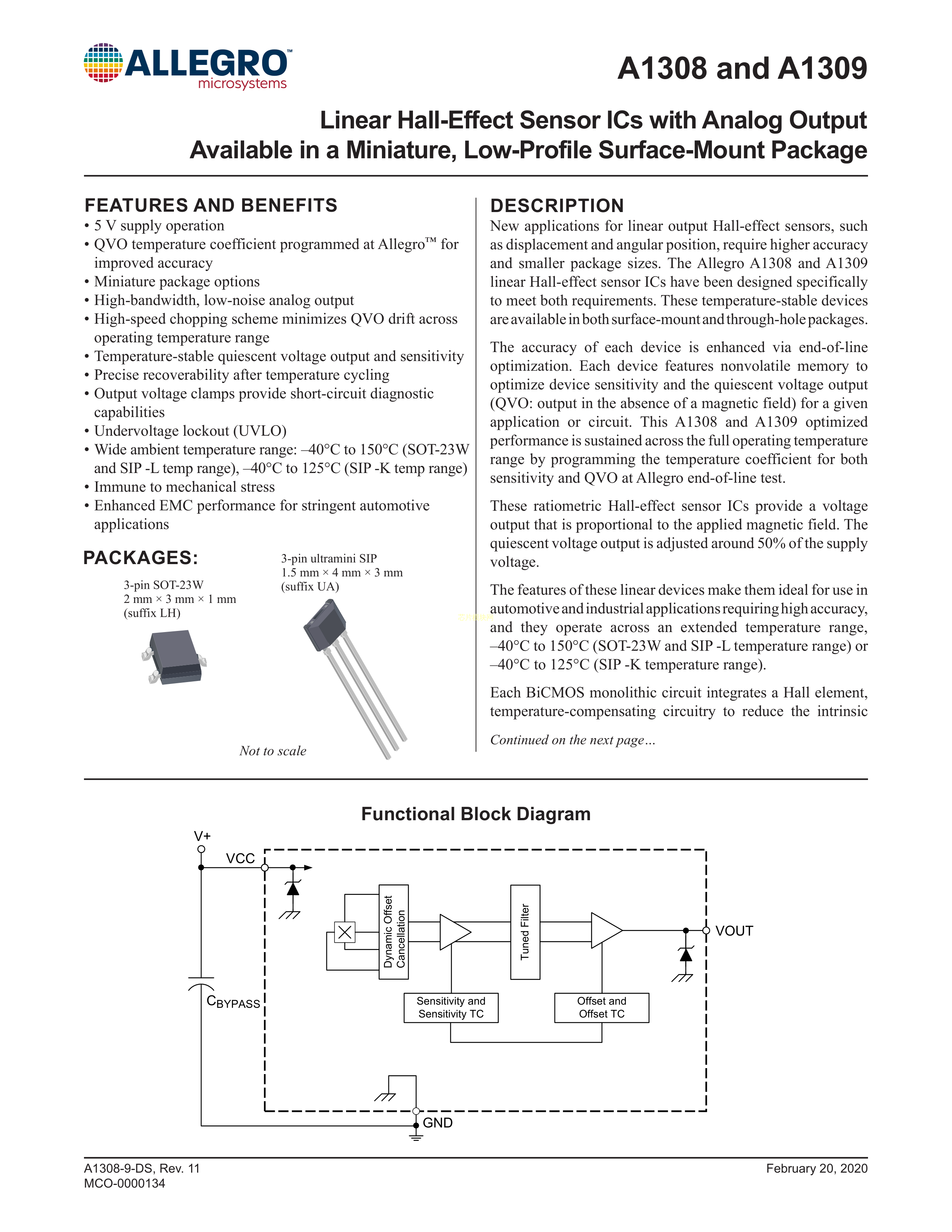 A1308LLHLX-2-T数据手册SOT-23W封装ALLEGRO(美国埃戈罗)PDF规格书,中英