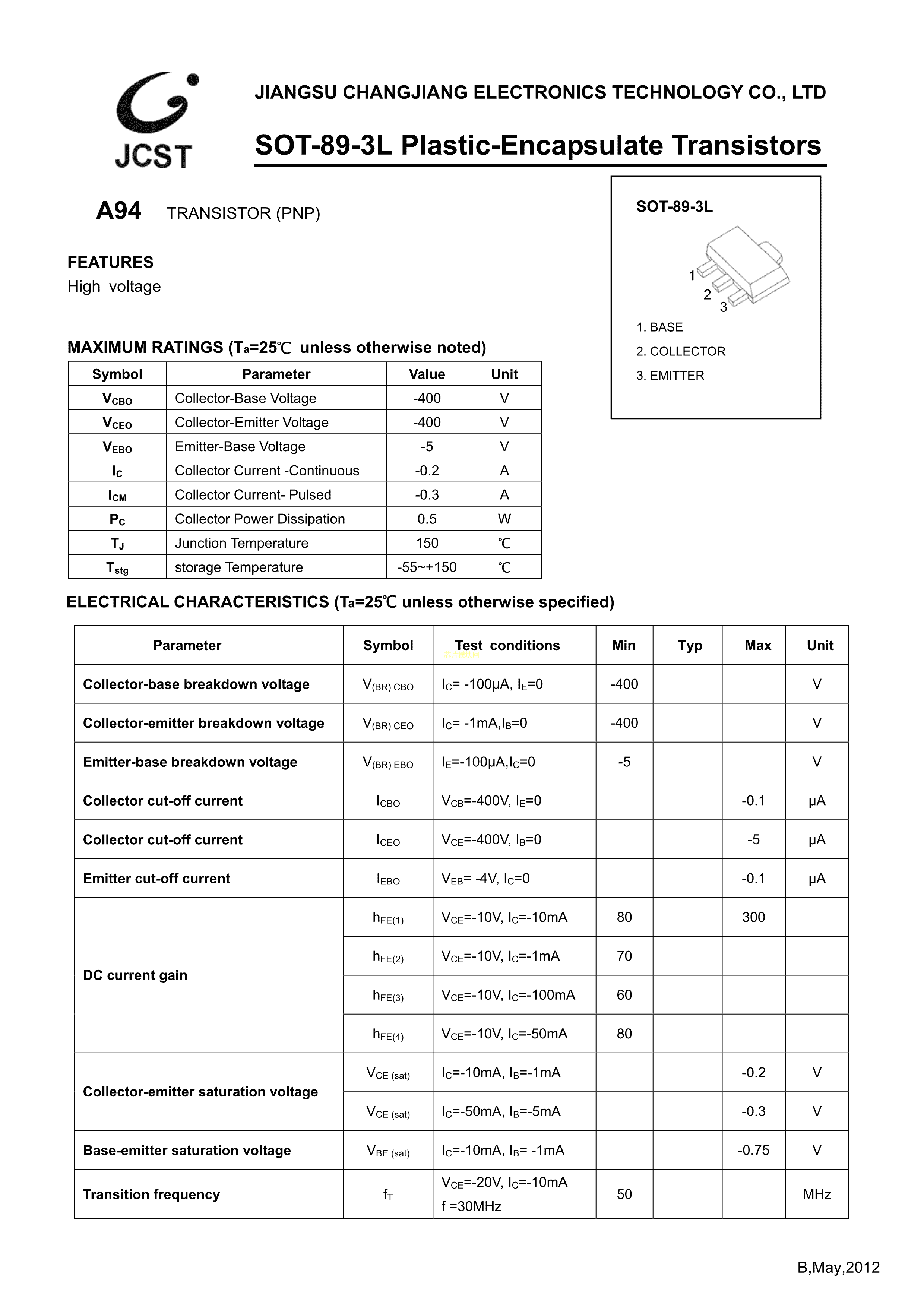 A94数据手册SOT-89(SOT-89-3)封装CJ(江苏长电-长晶)PDF规格书,中英文下载