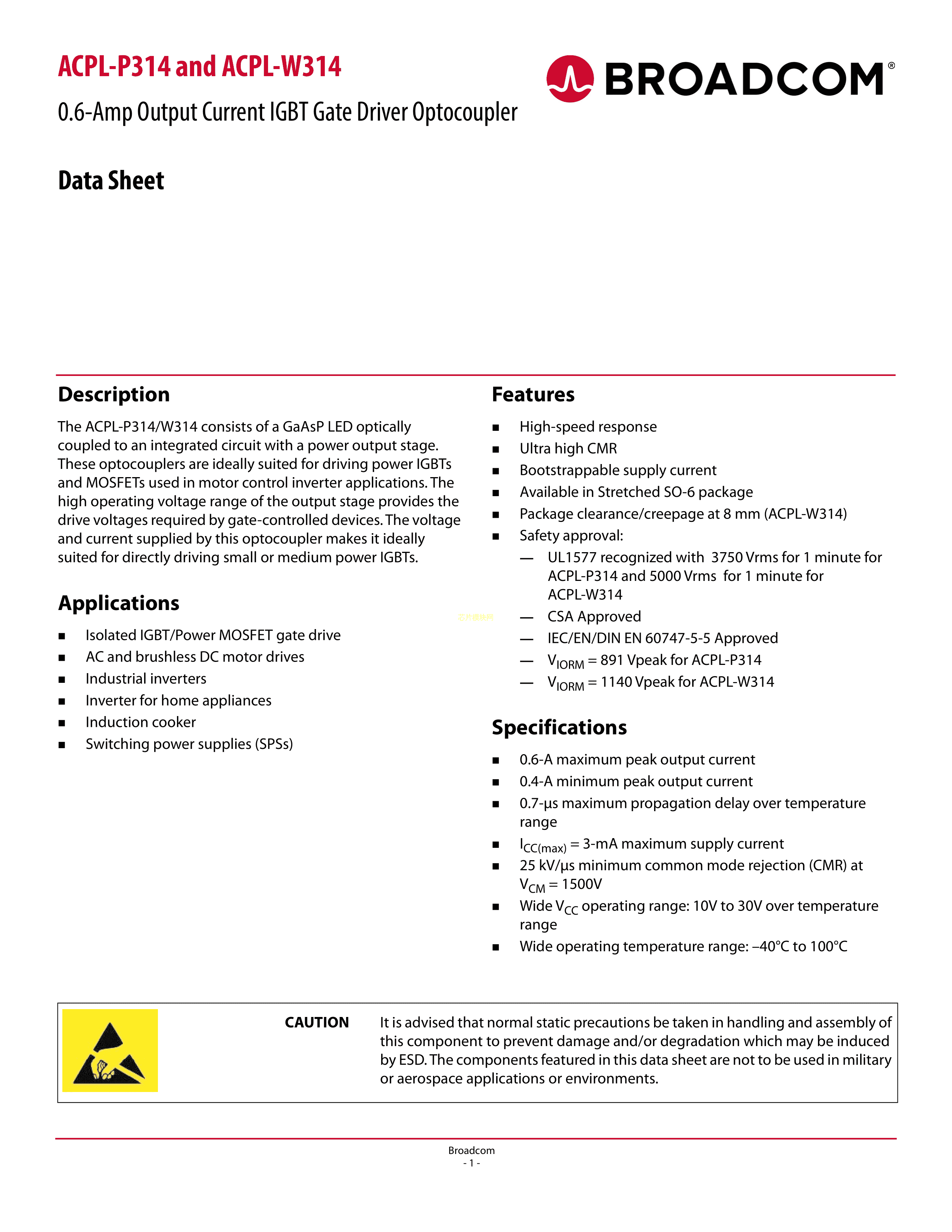 ACPL-P314-500E数据手册SO-6封装AVAGO(安华高)PDF规格书,中英文下载