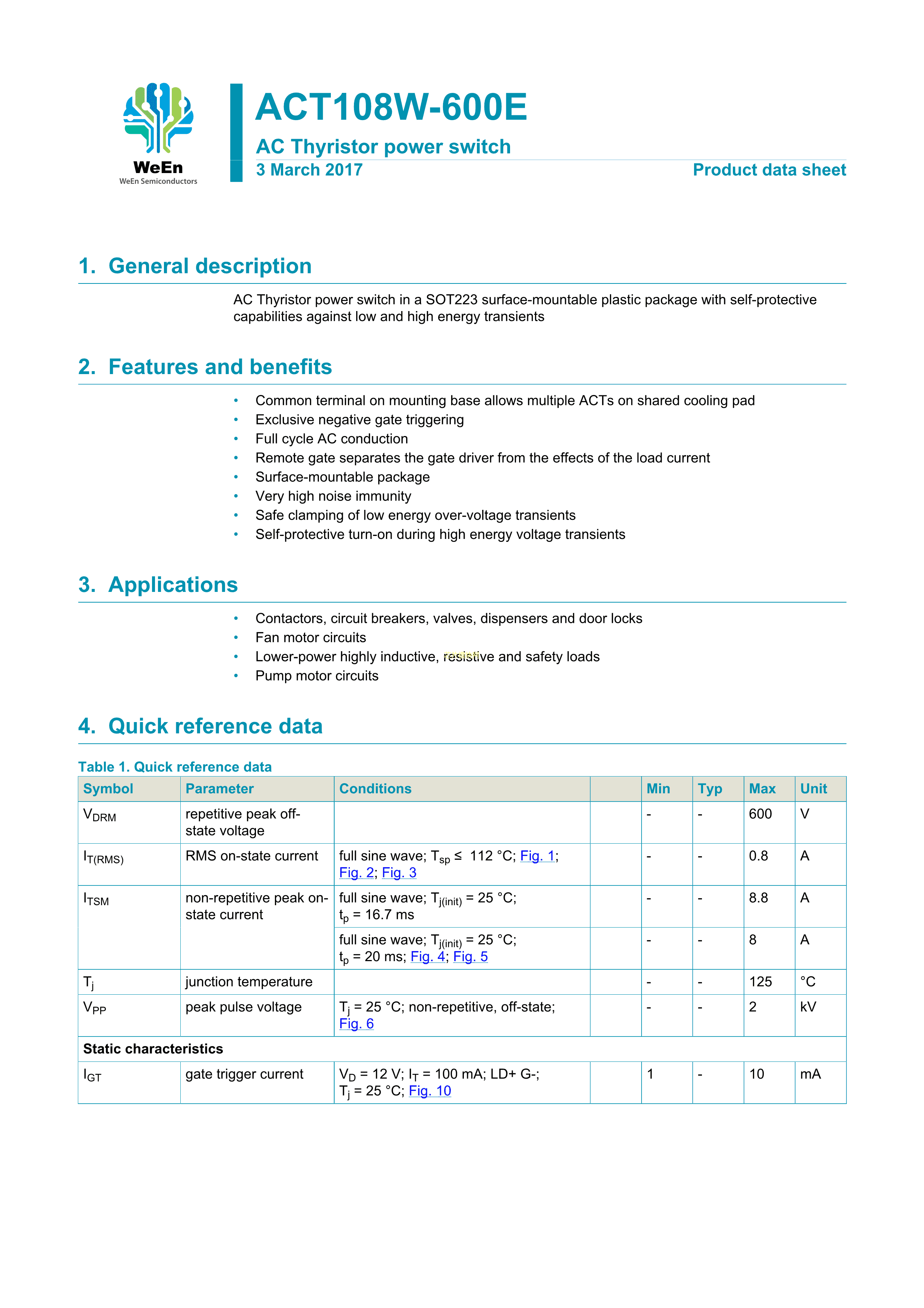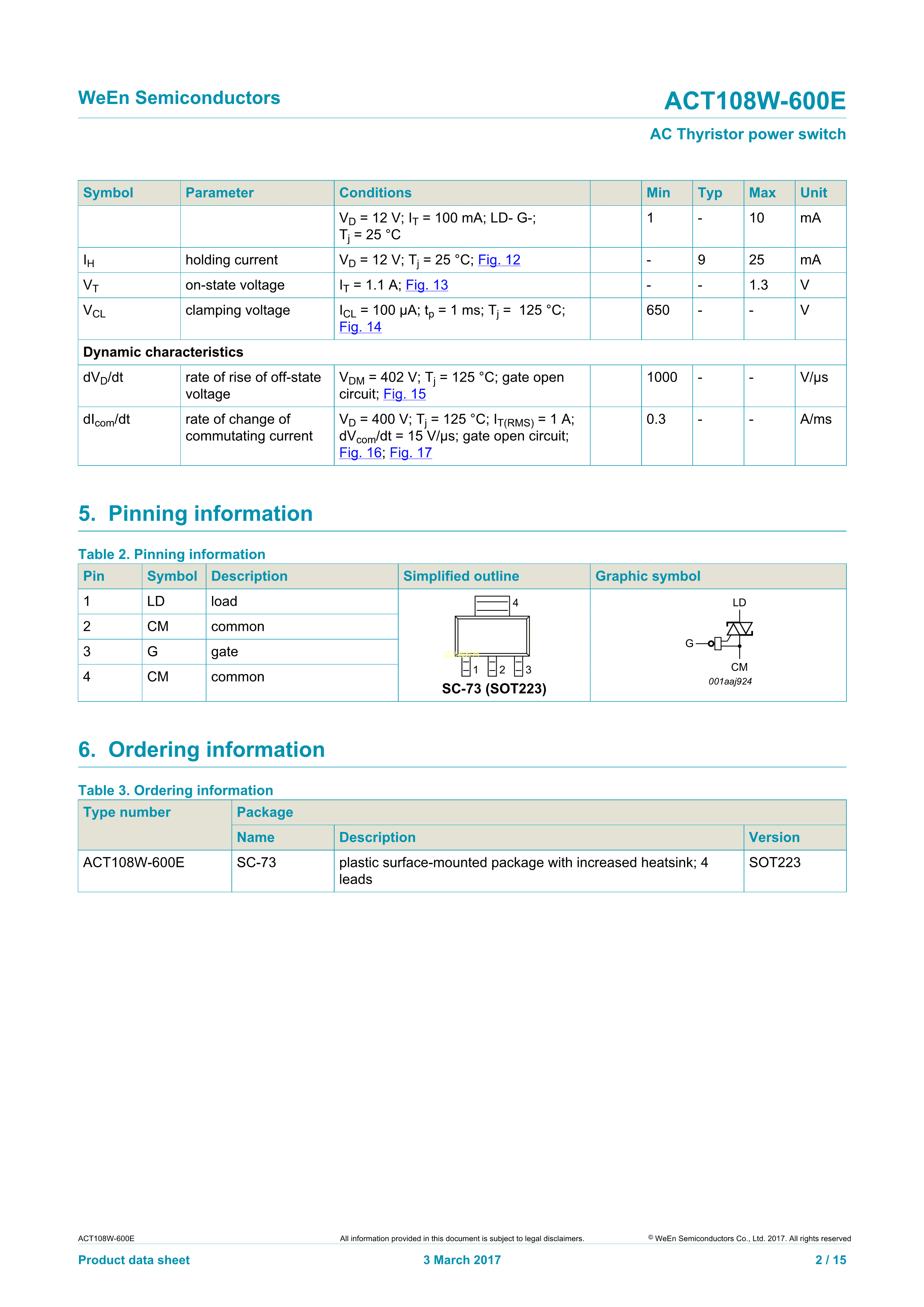 ACT108W-600E135数据手册SC-73-4封装WeEn(瑞能)PDF规格书,中英文下载