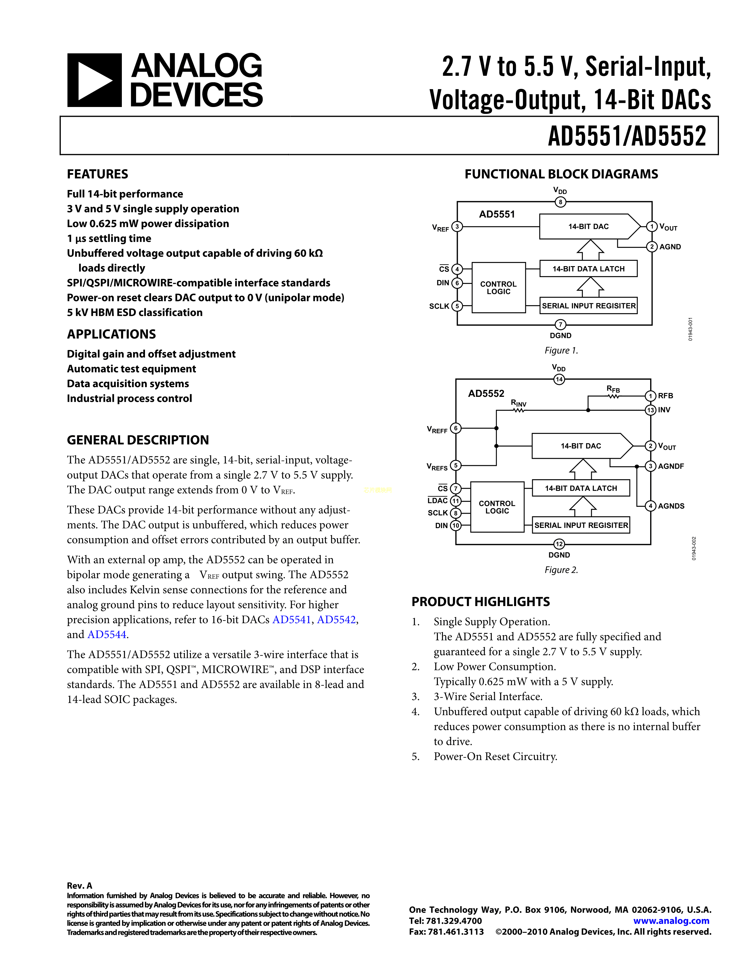 AD5552BRZ数据手册SOIC-14封装ADI(亚德诺)-LINEARPDF规格书,中英文下载