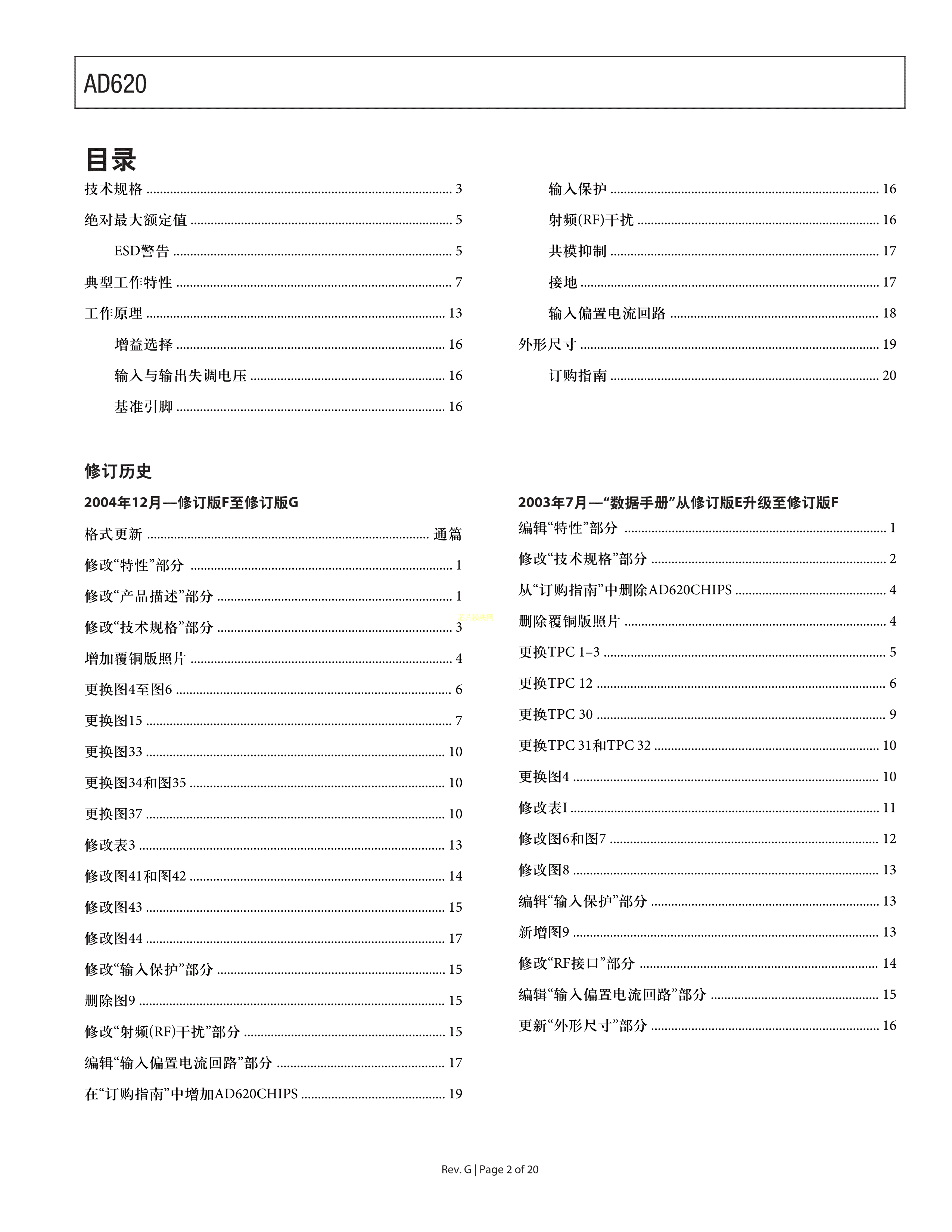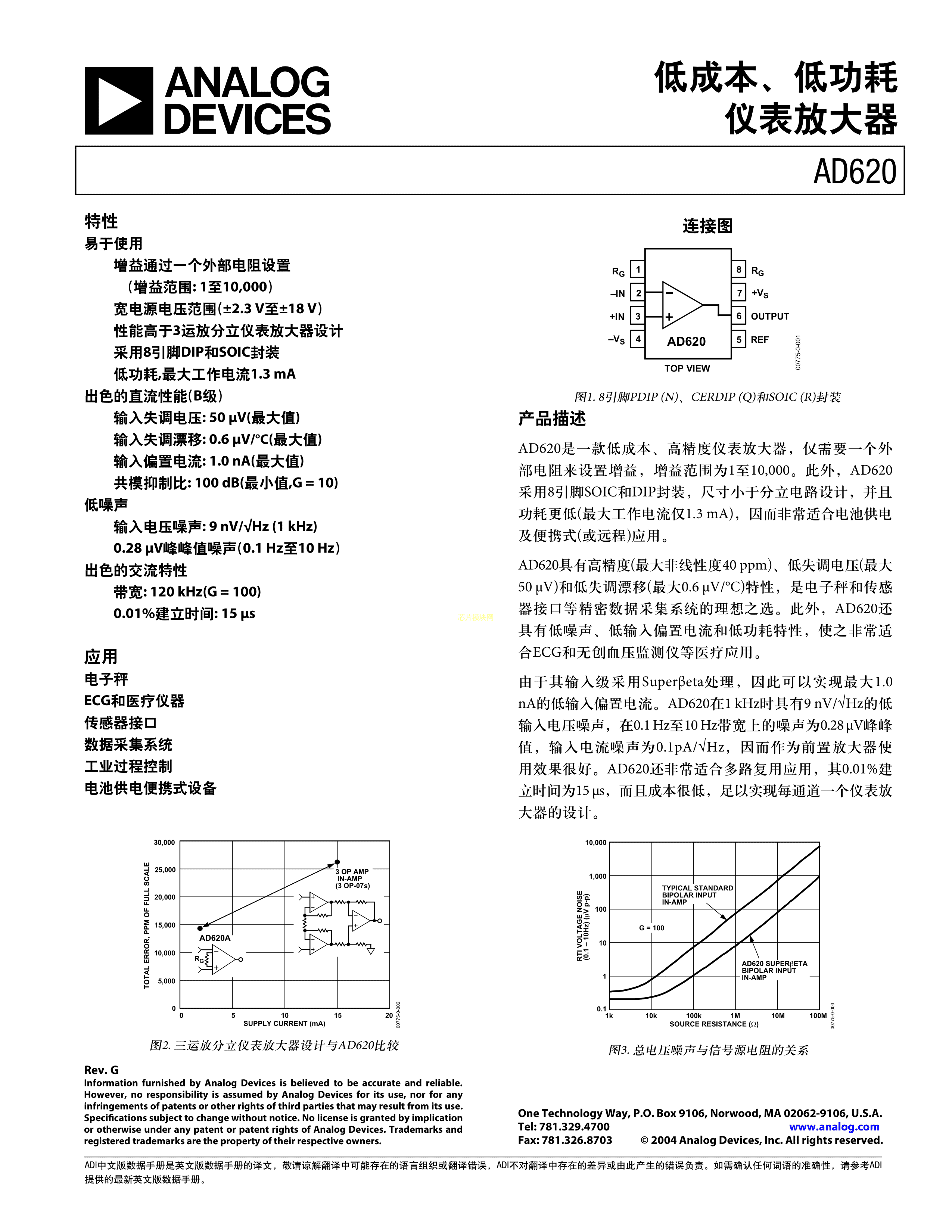 AD620ARZ数据手册SOIC-8封装ADI(亚德诺)-LINEARPDF规格书,中英文下载