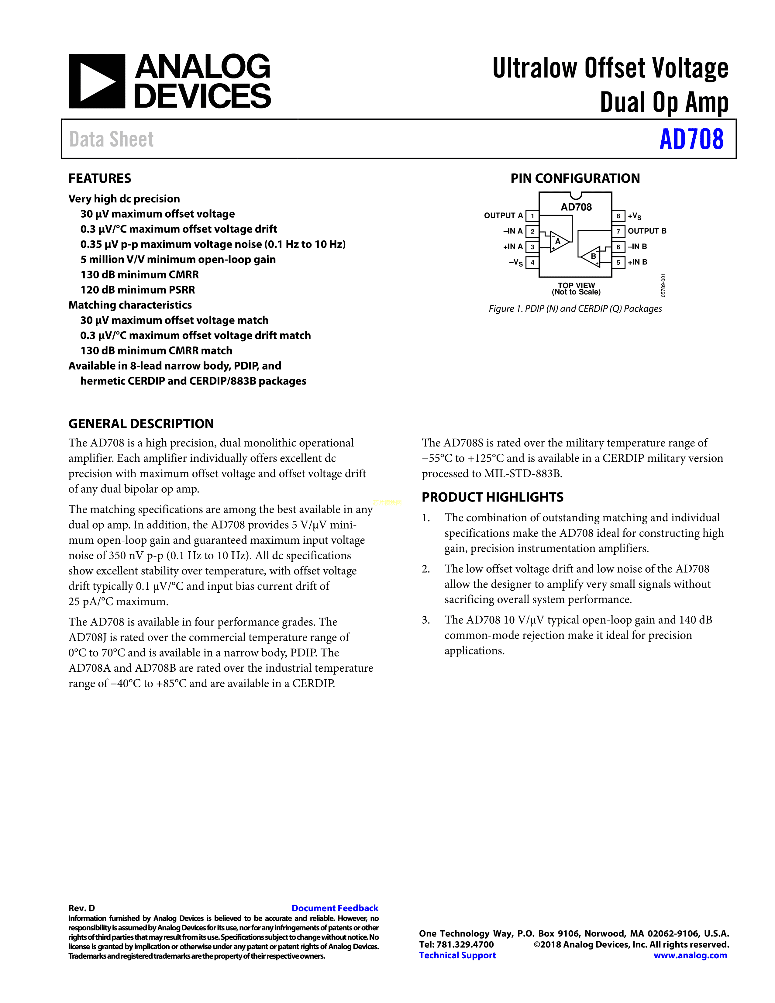 AD708SQ-883B数据手册CDIP-8封装ADI(亚德诺)-LINEARPDF规格书,中英文下