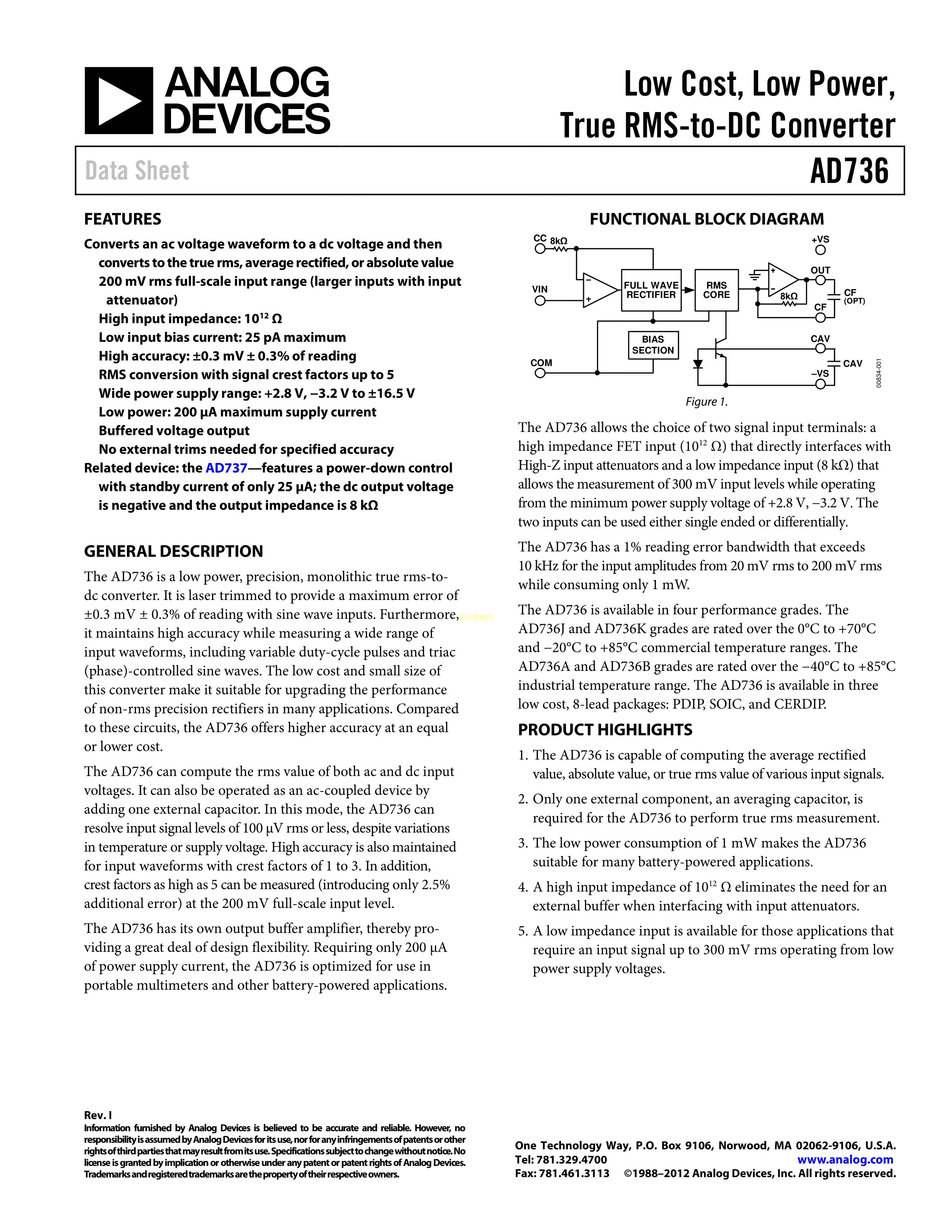 AD736KRZ-R7数据手册SOIC-8封装ADI(亚德诺)-LINEARPDF规格书,中英文下载
