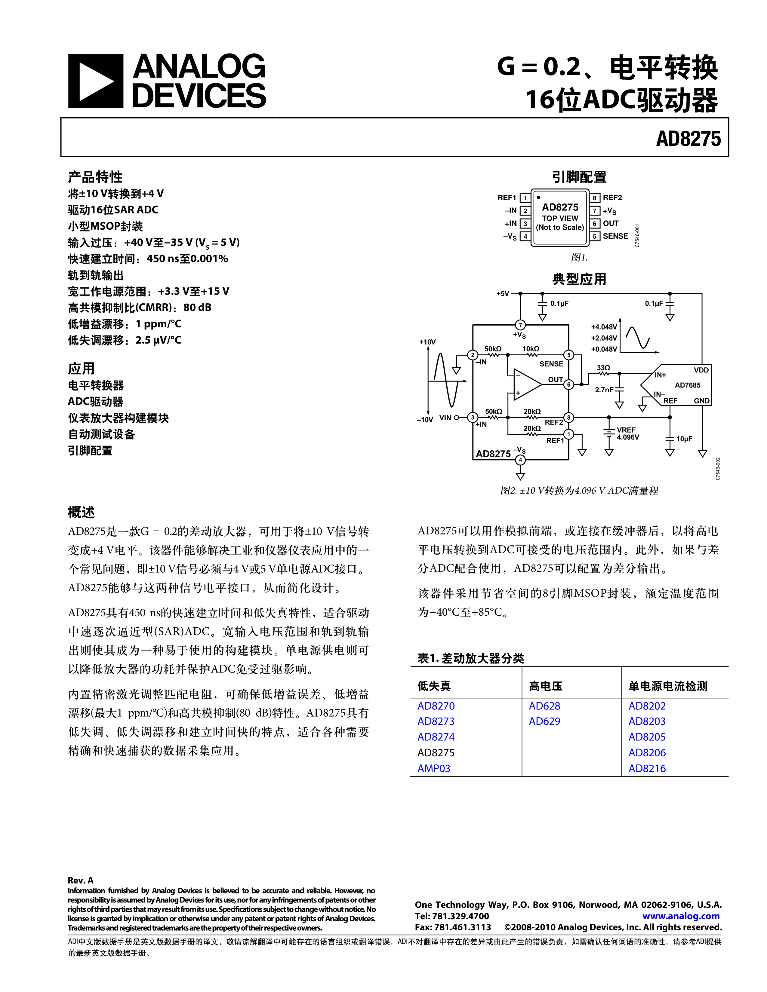 AD8275BRMZ数据手册MSOP-8封装ADI(亚德诺)-LINEARPDF规格书,中英文下载