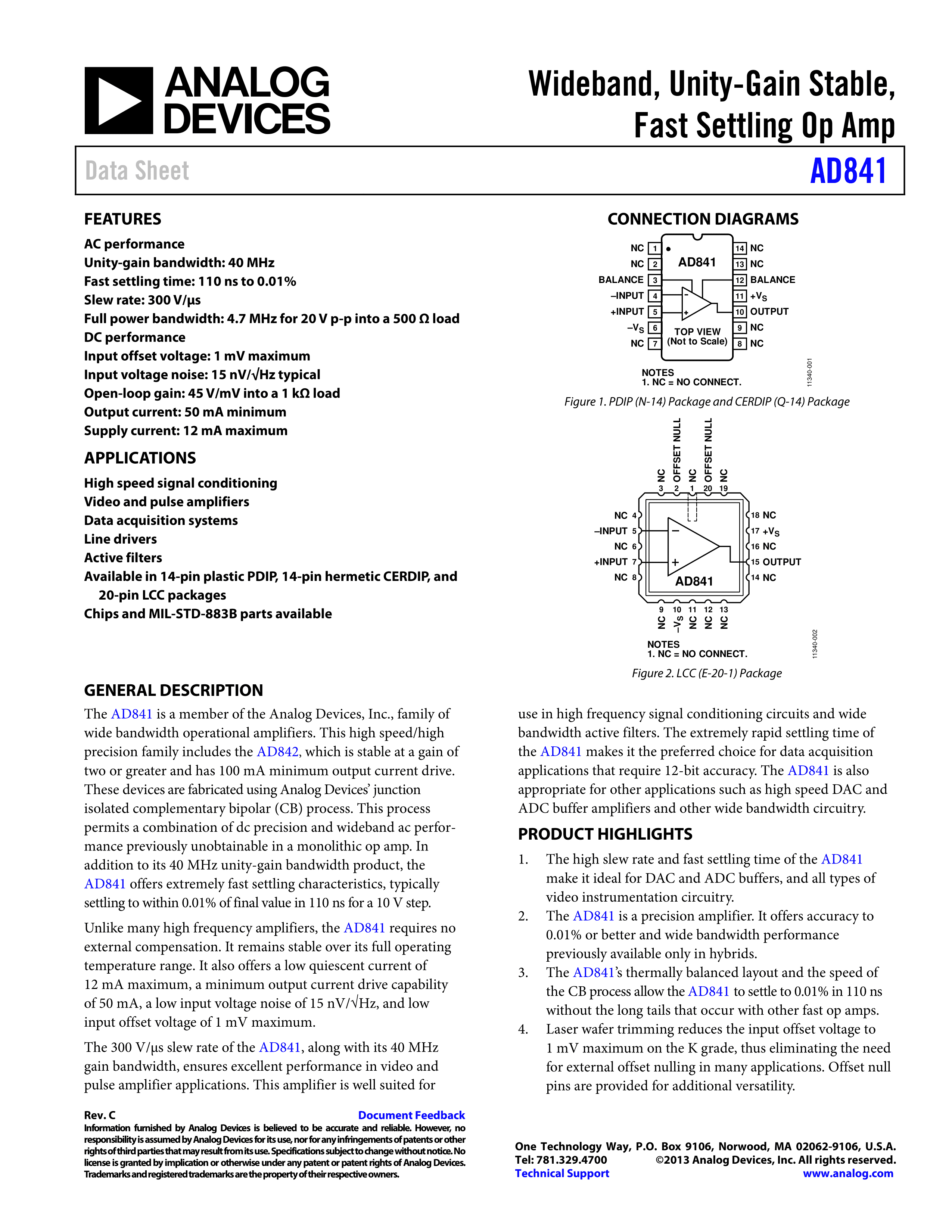 AD841SQ-883B数据手册CDIP-14封装ADI(亚德诺)-LINEARPDF规格书,中英文