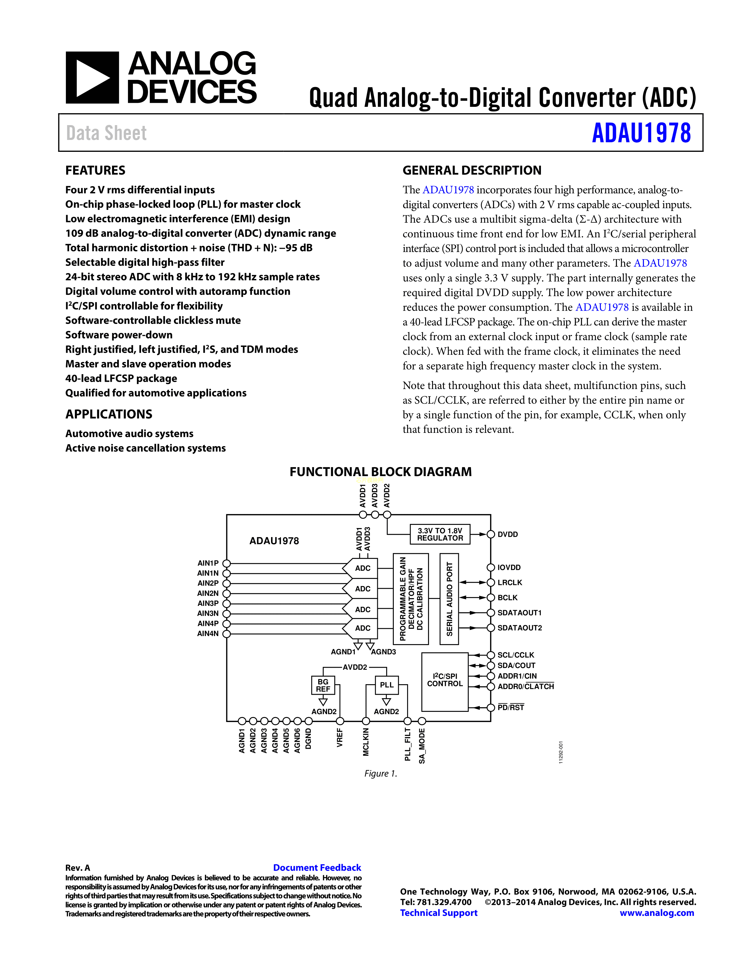 ADAU1978WBCPZ-RL数据手册LFCSP-40封装ADI(亚德诺)-LINEARPDF规格