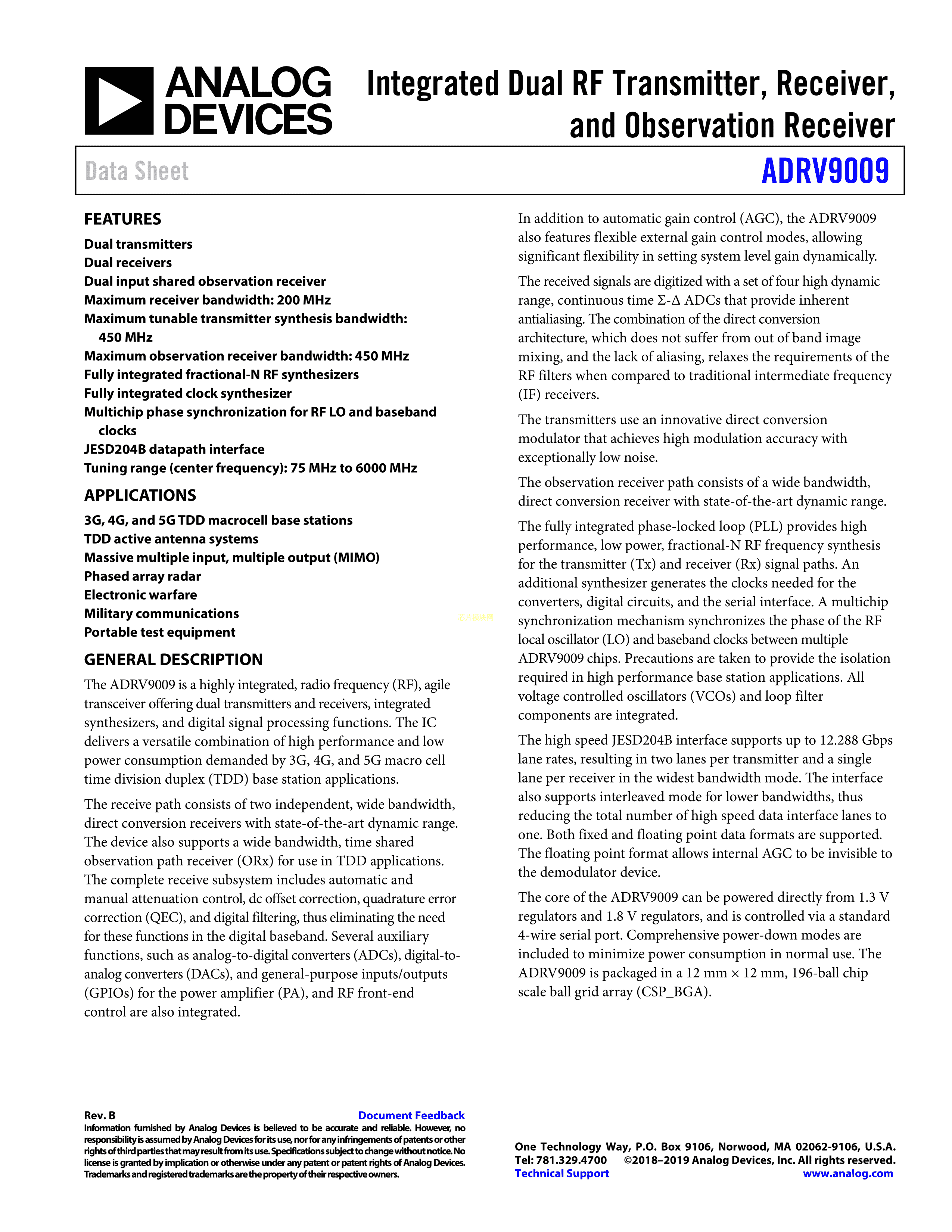 ADRV9009BBCZ数据手册BGA-196封装ADI(亚德诺)-LINEARPDF规格书,中英文下载