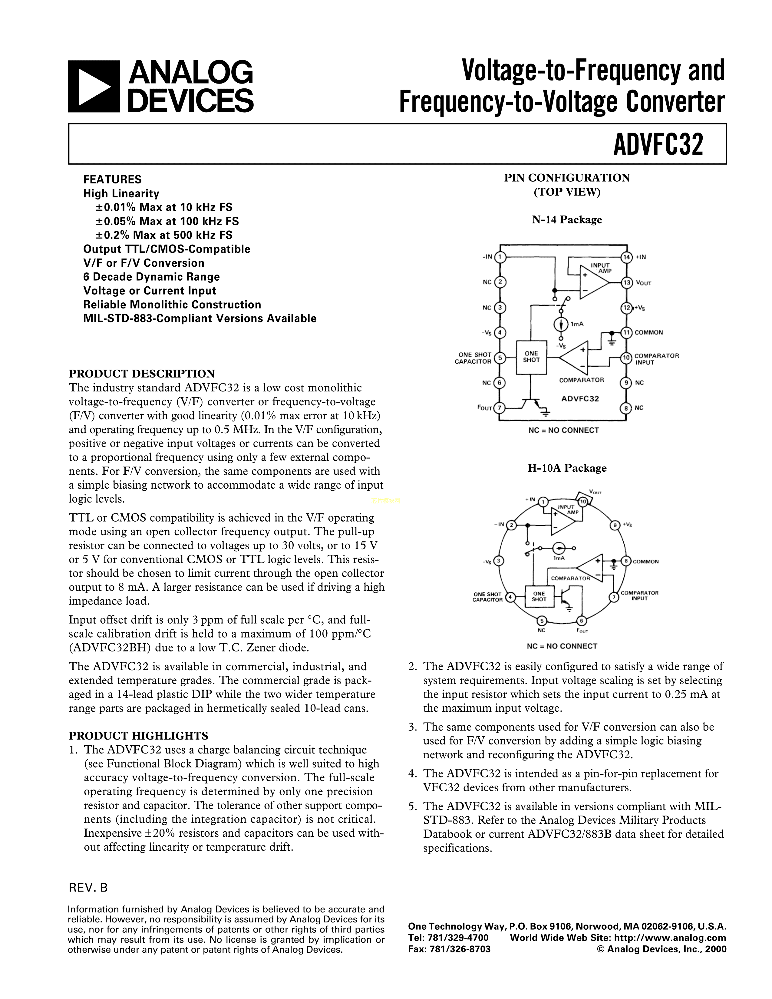 ADVFC32SH-883B数据手册TO-100-10封装ADI(亚德诺)-LINEARPDF规格书