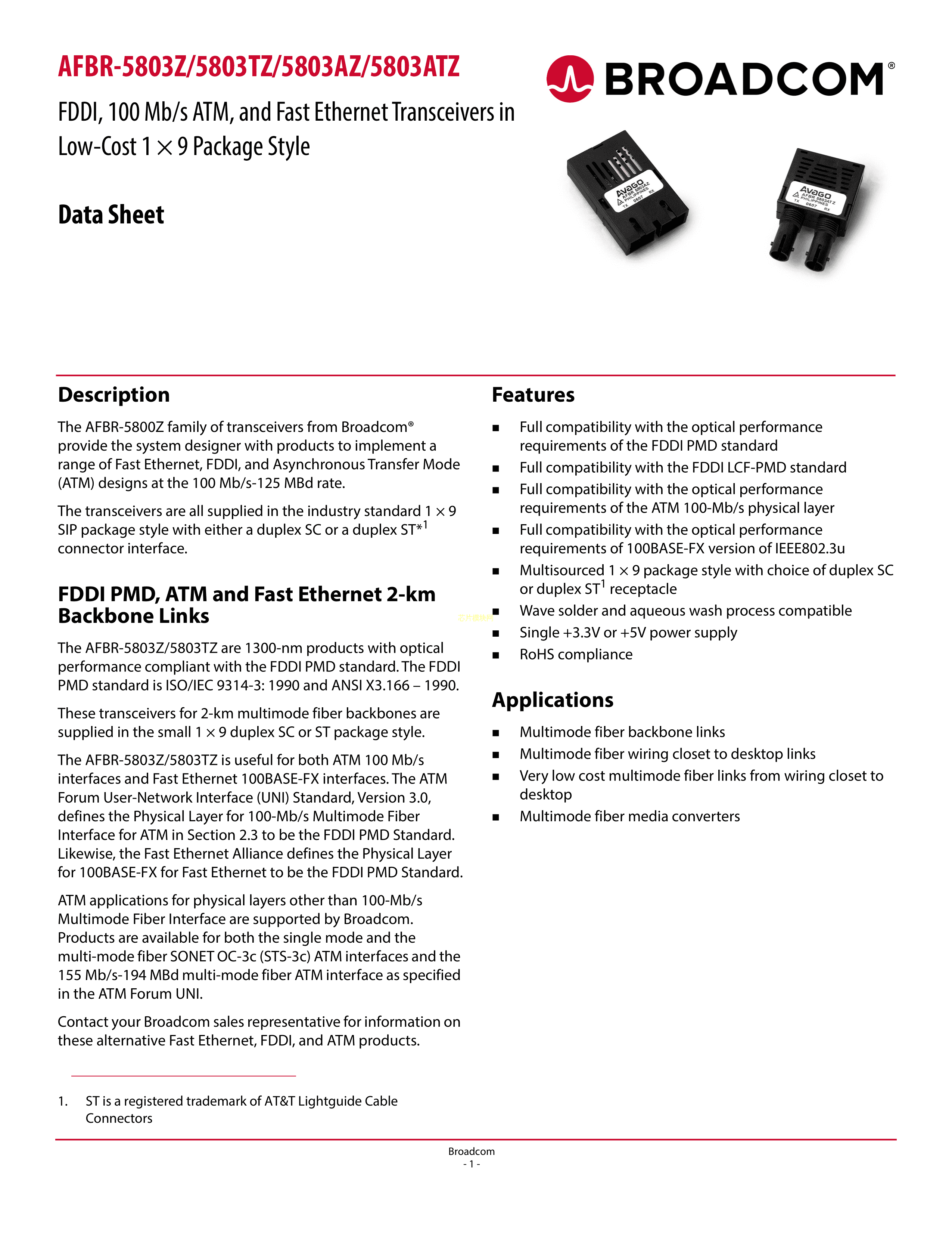 AFBR-5803ATZ数据手册ThroughHole封装AVAGO(安华高)PDF规格书,中英文下