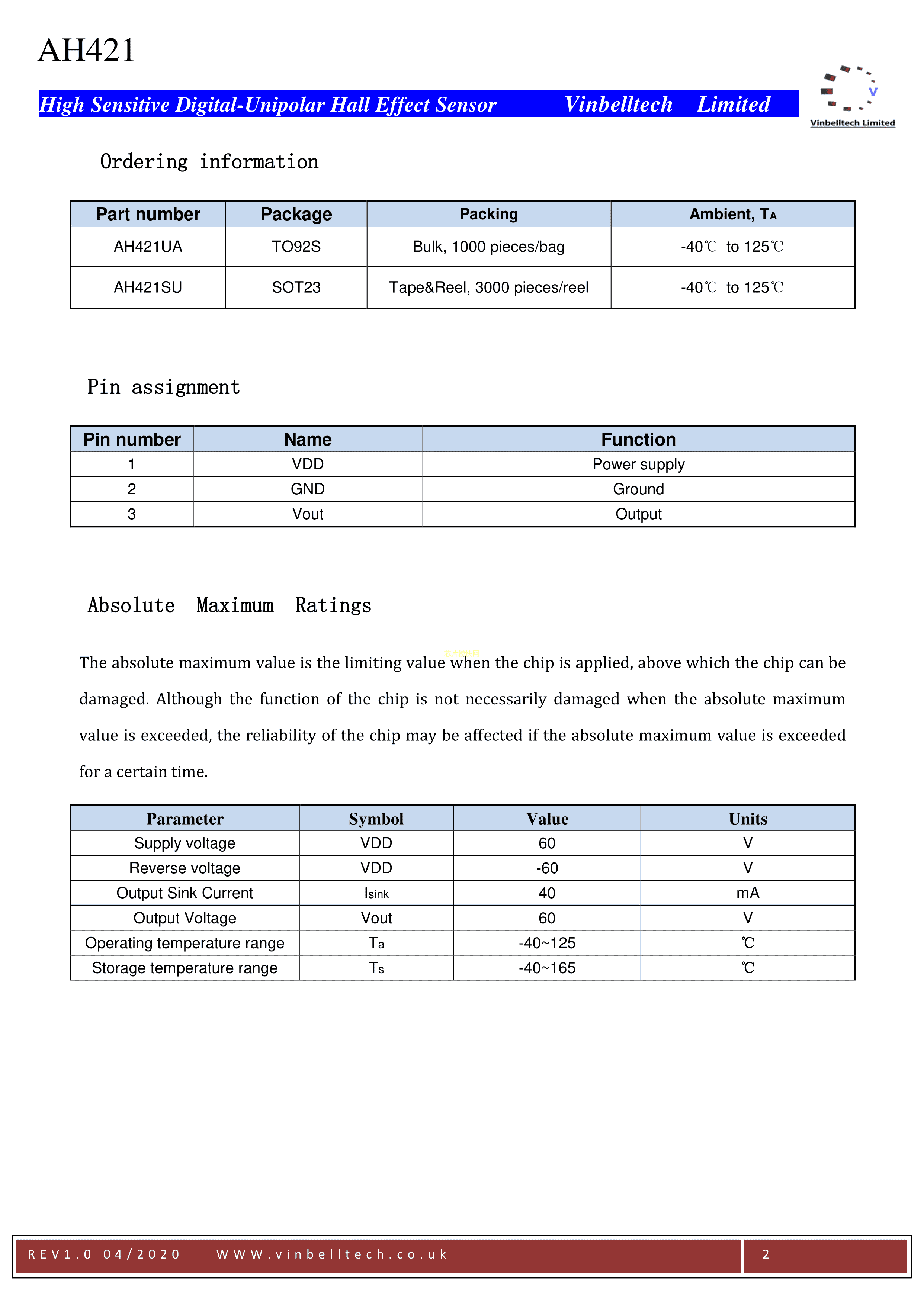 AH421数据手册TO-92S封装Alfa(中科阿尔法)PDF规格书,中英文下载
