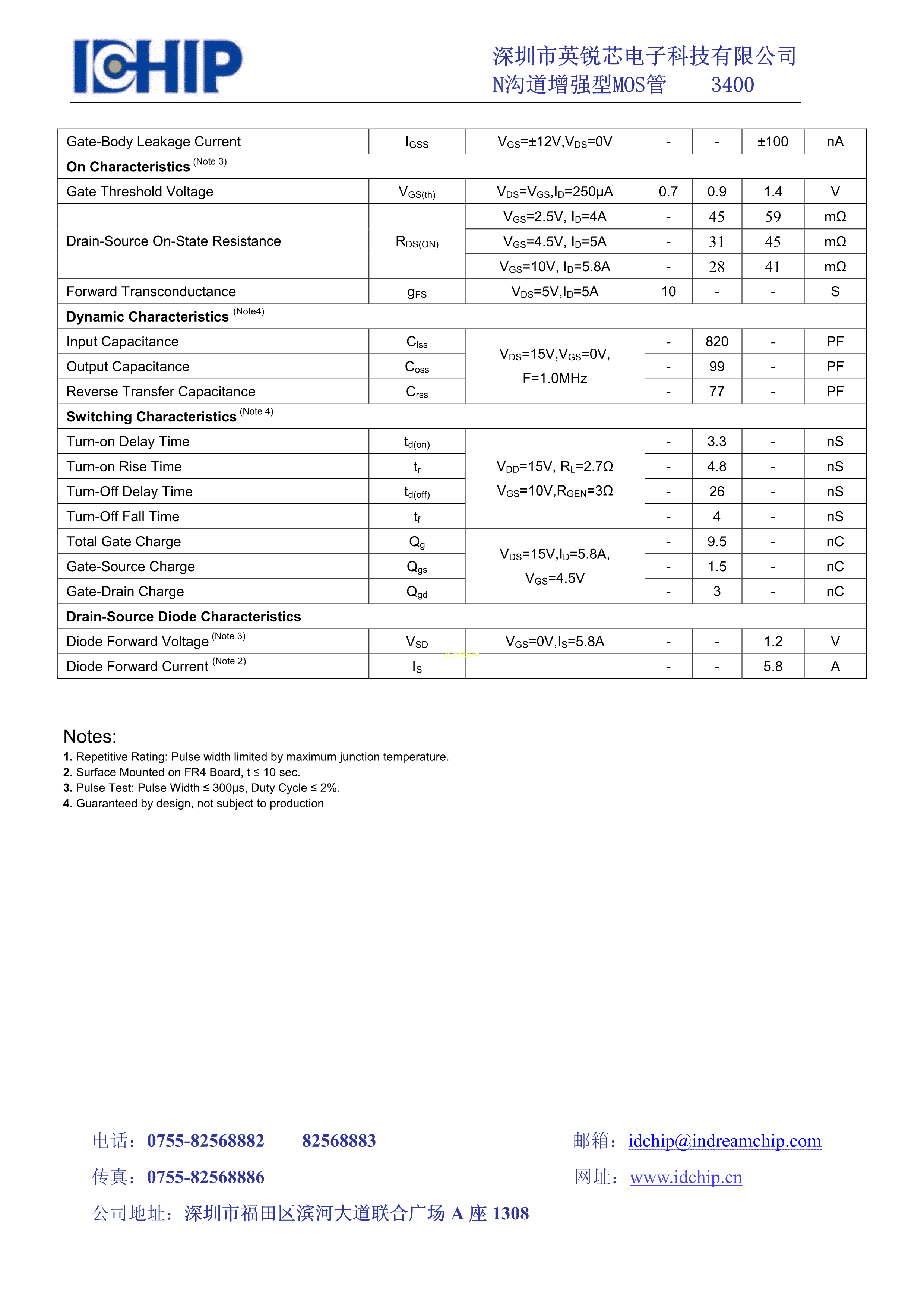 AO3400数据手册SOT-23封装IDCHIP(英锐芯)PDF规格书,中英文下载