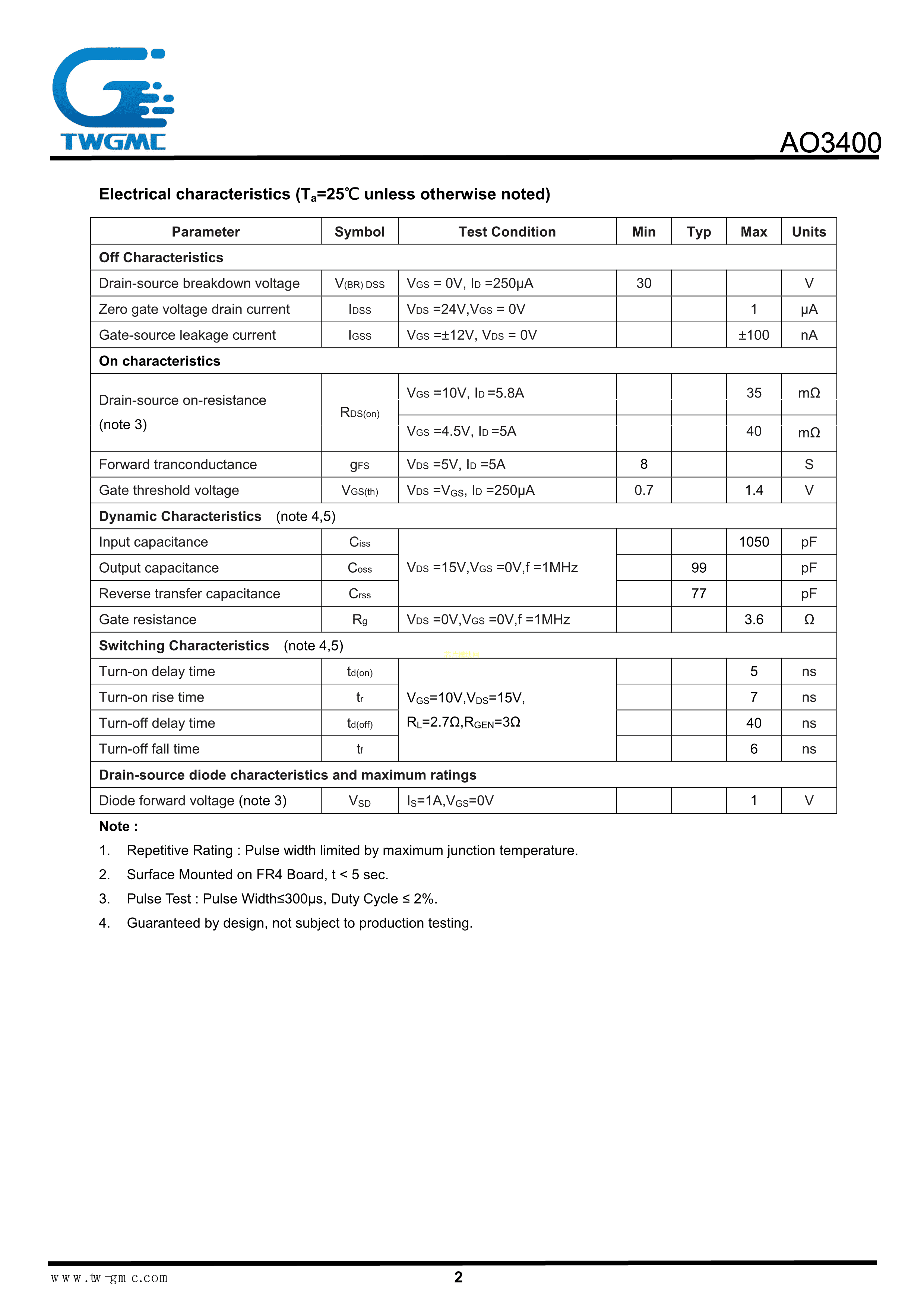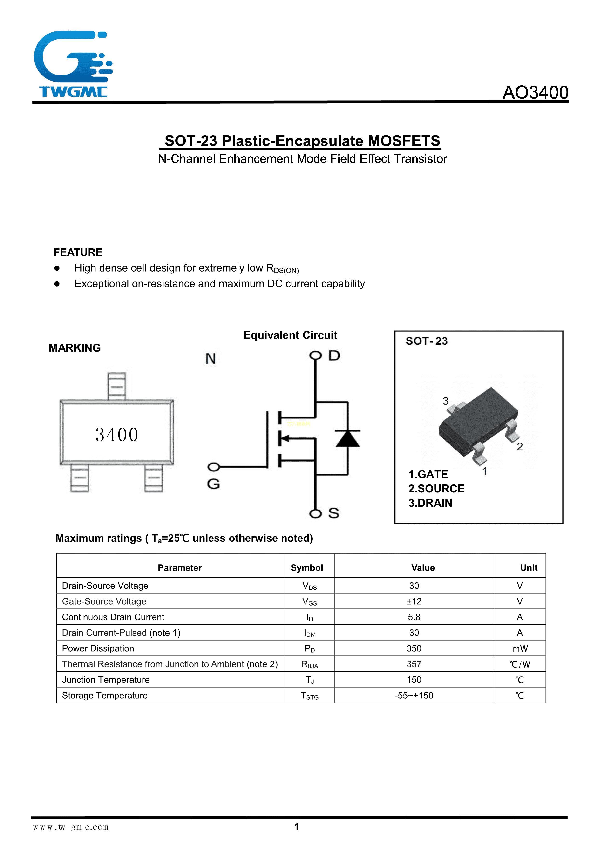 AO3400数据手册SOT-23封装TWGMC(台湾迪嘉)PDF规格书,中英文下载