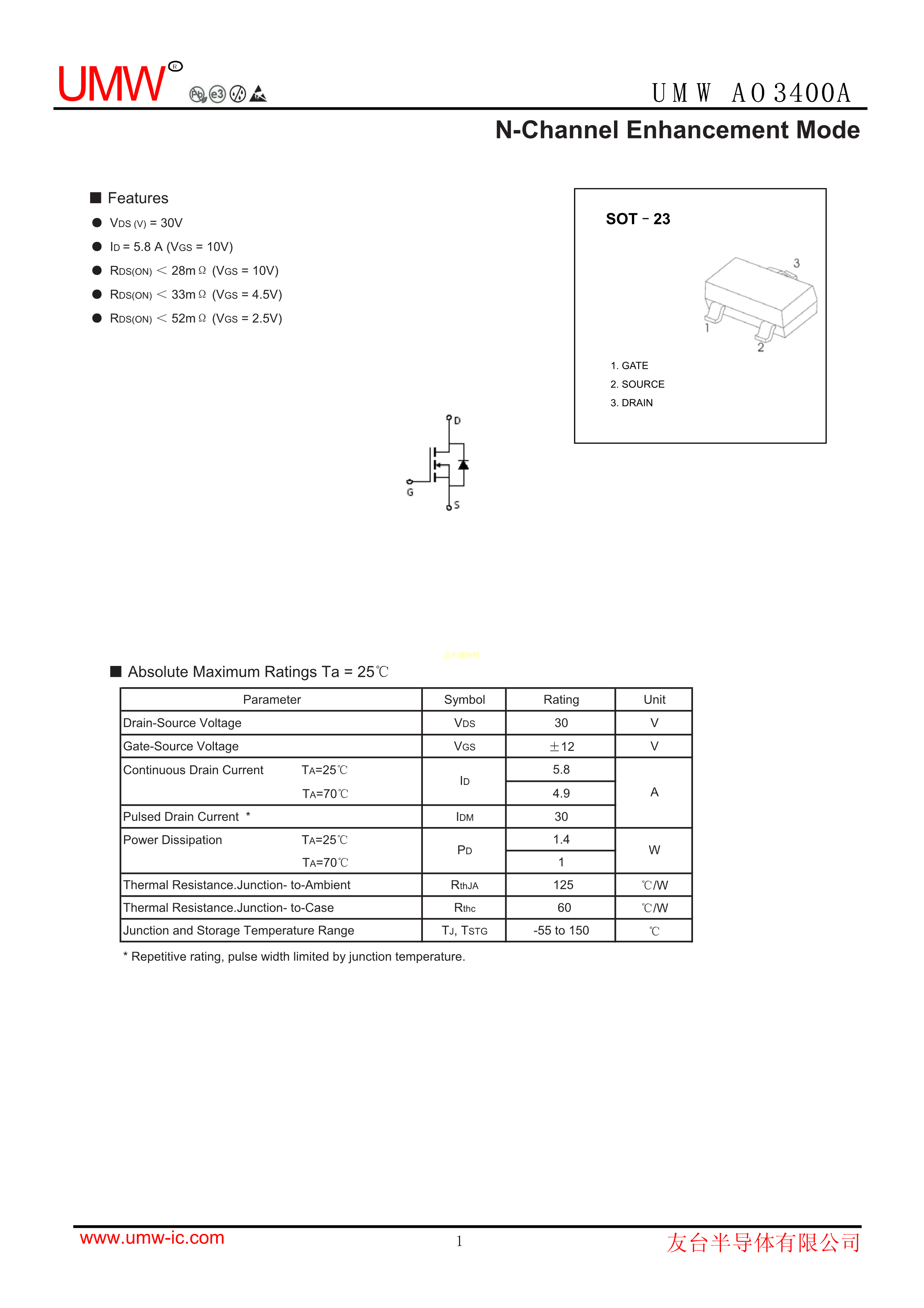 AO3400A数据手册SOT-23封装UMW(友台半导体)PDF规格书,中英文下载