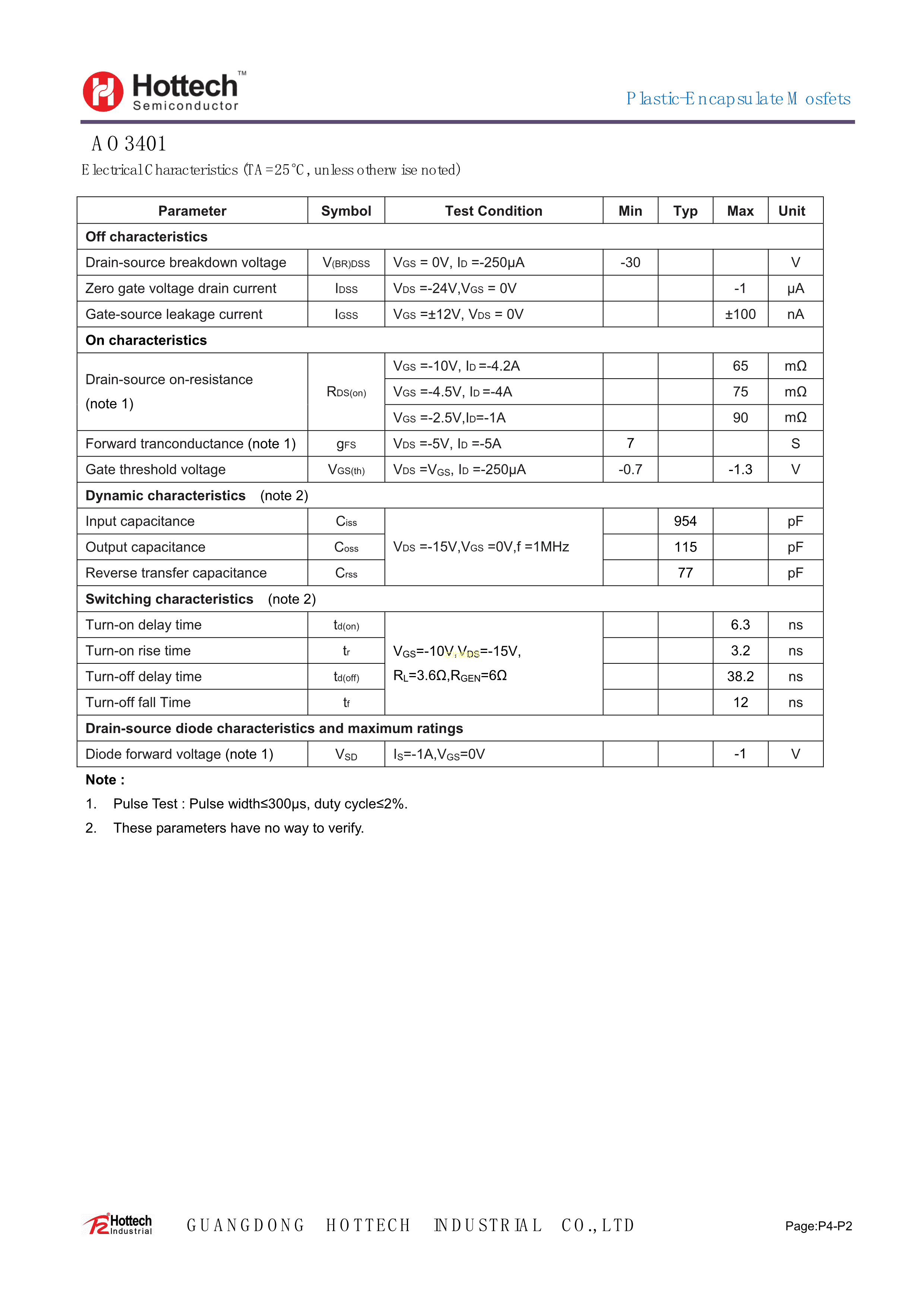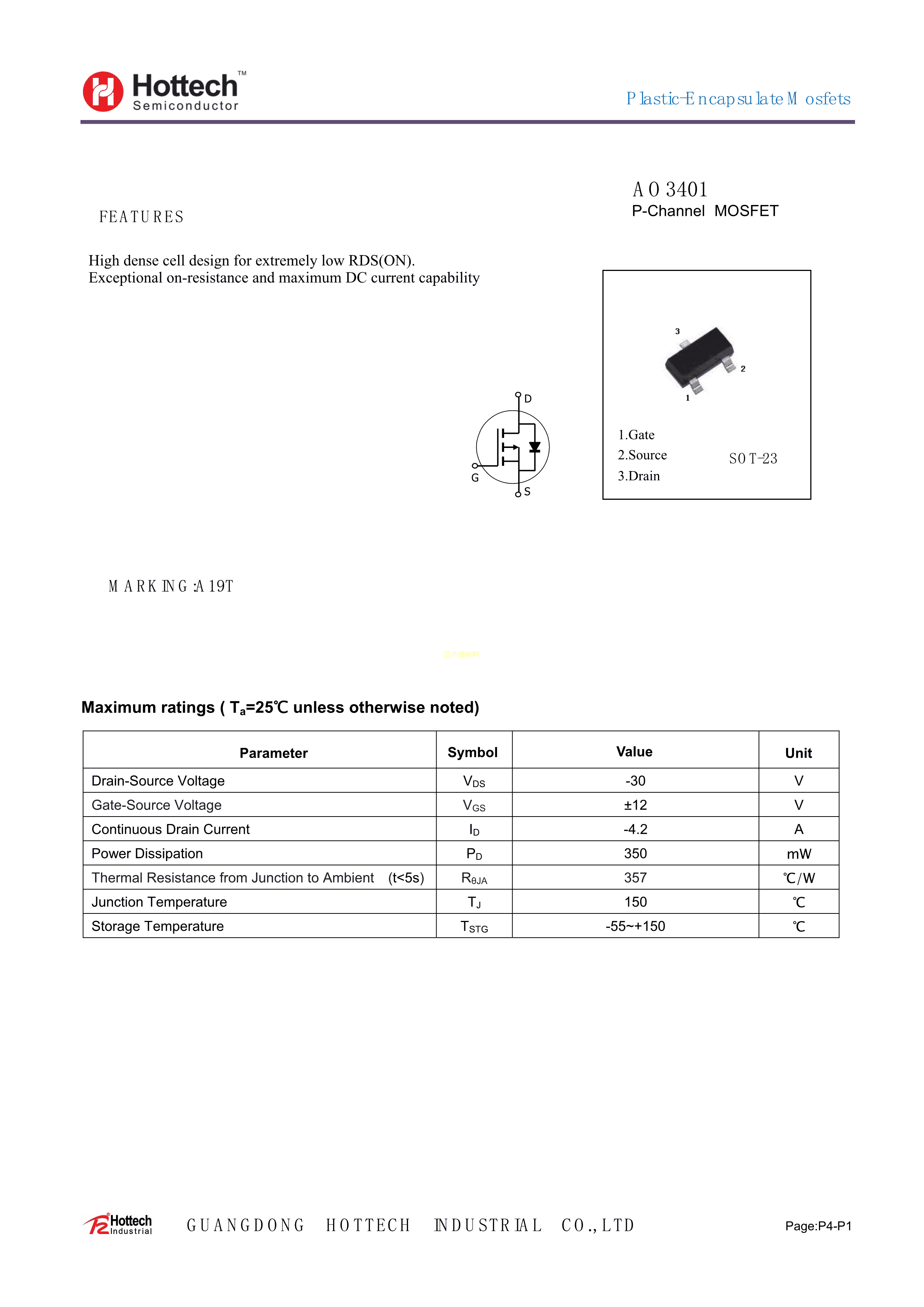 AO3401数据手册SOT-23(SOT-23-3)封装Hottech(合科泰)PDF规格书,中英文