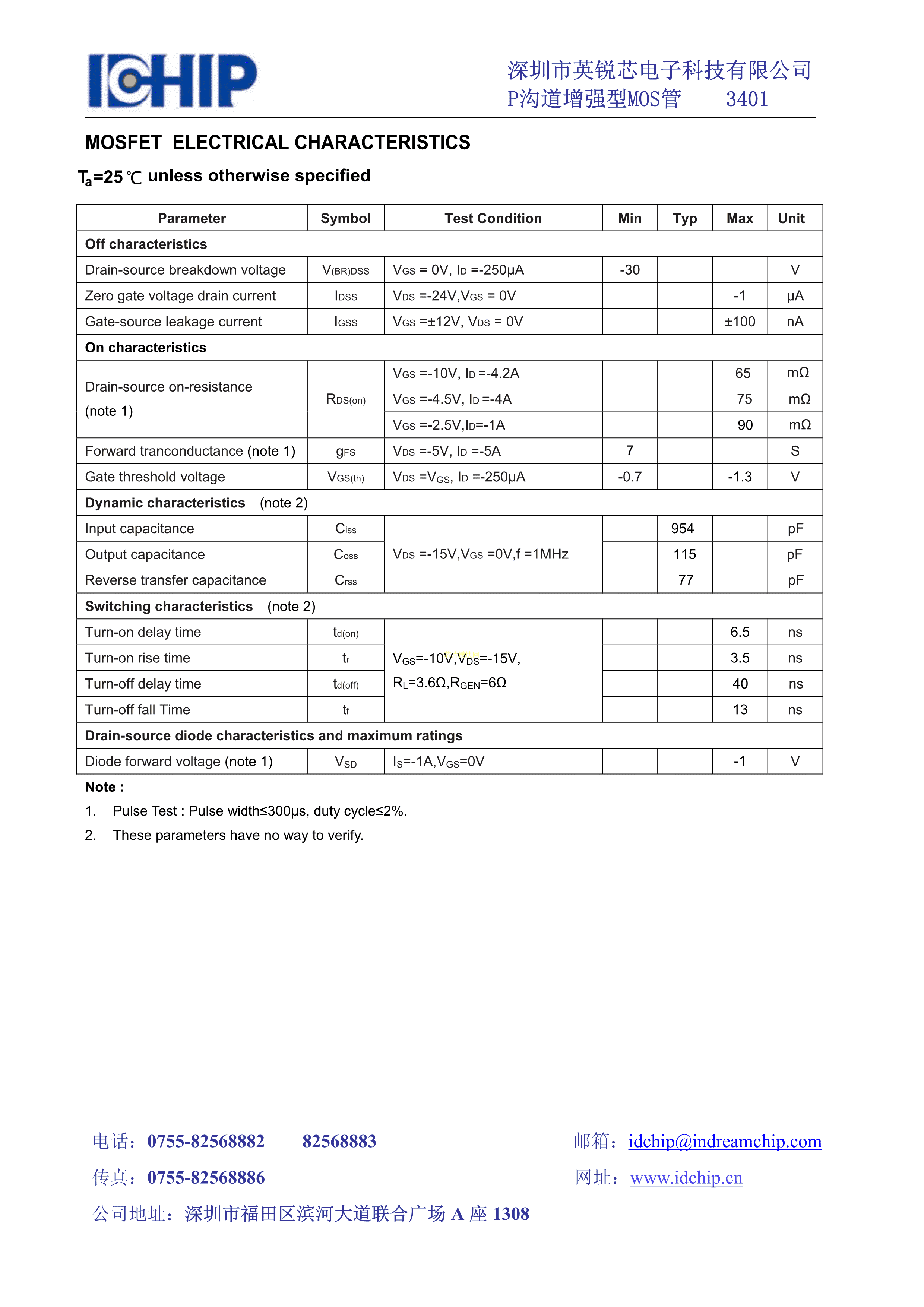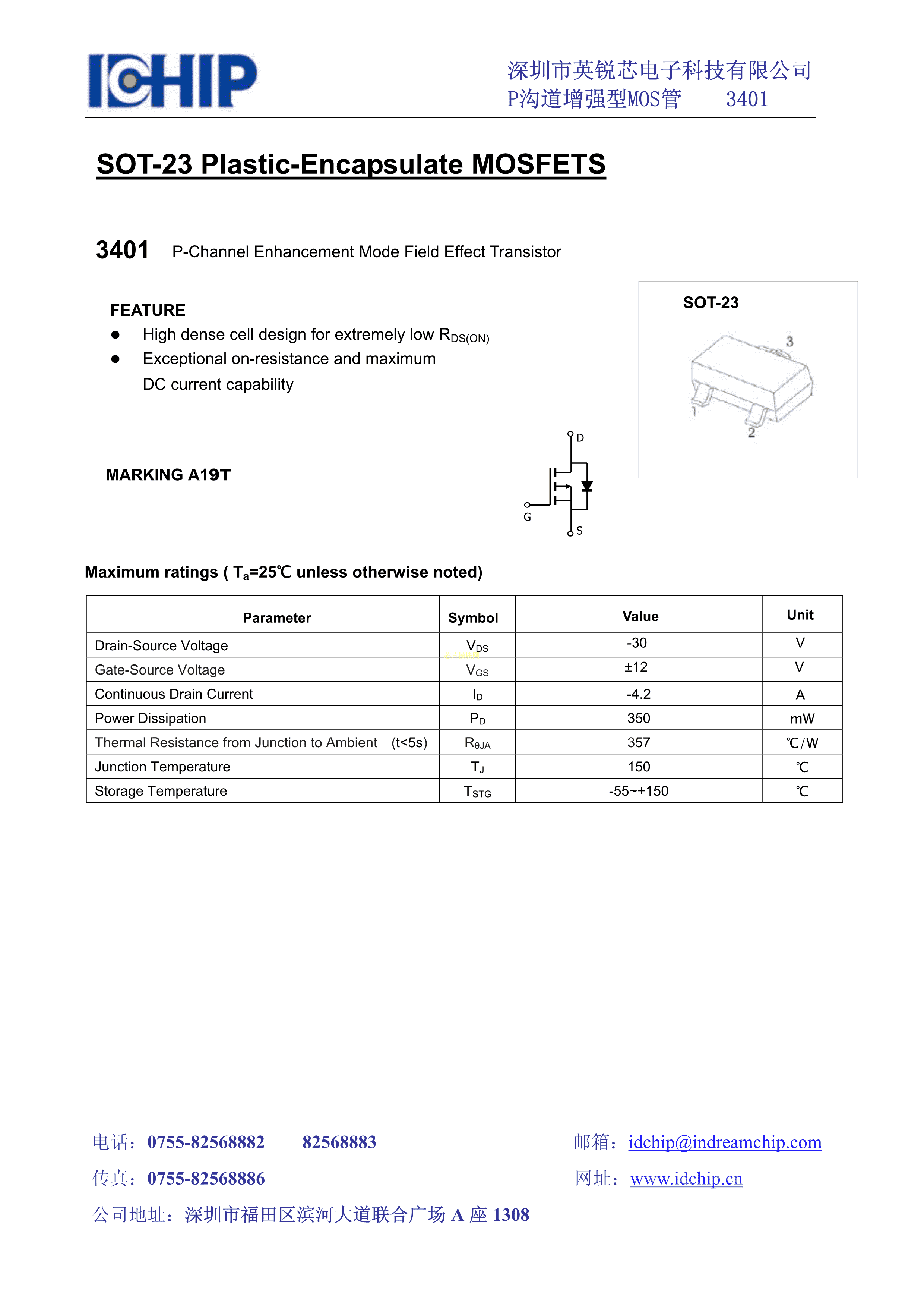 AO3401数据手册SOT-23封装IDCHIP(英锐芯)PDF规格书,中英文下载