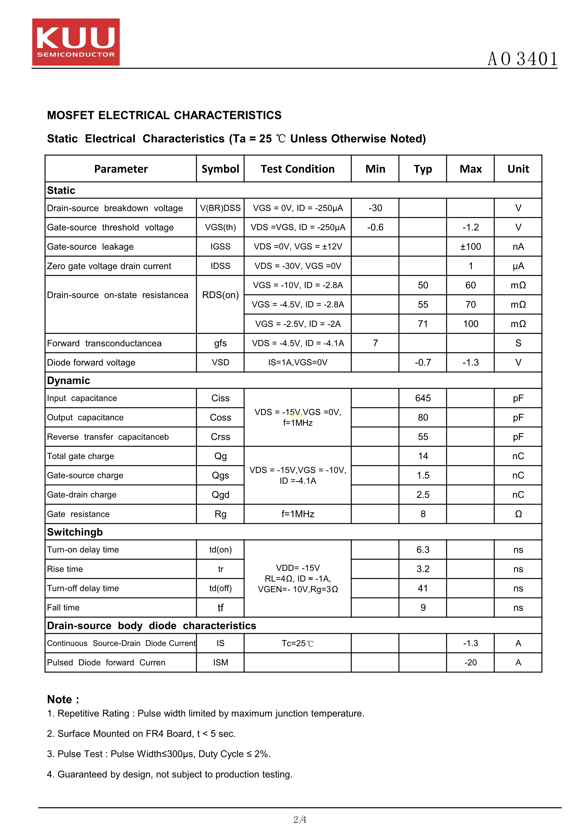 AO3401数据手册SOT-23封装KUUPDF规格书,中英文下载
