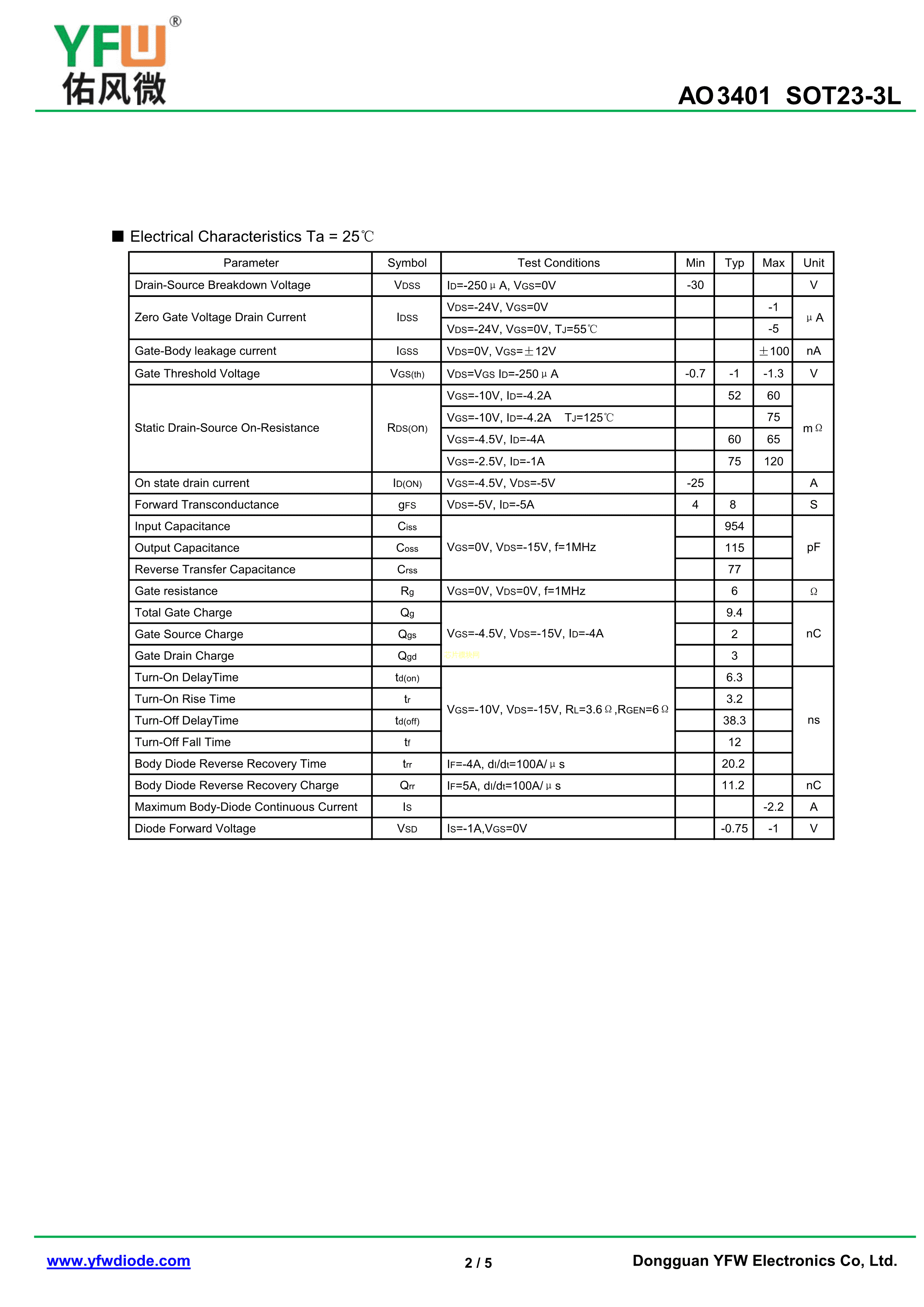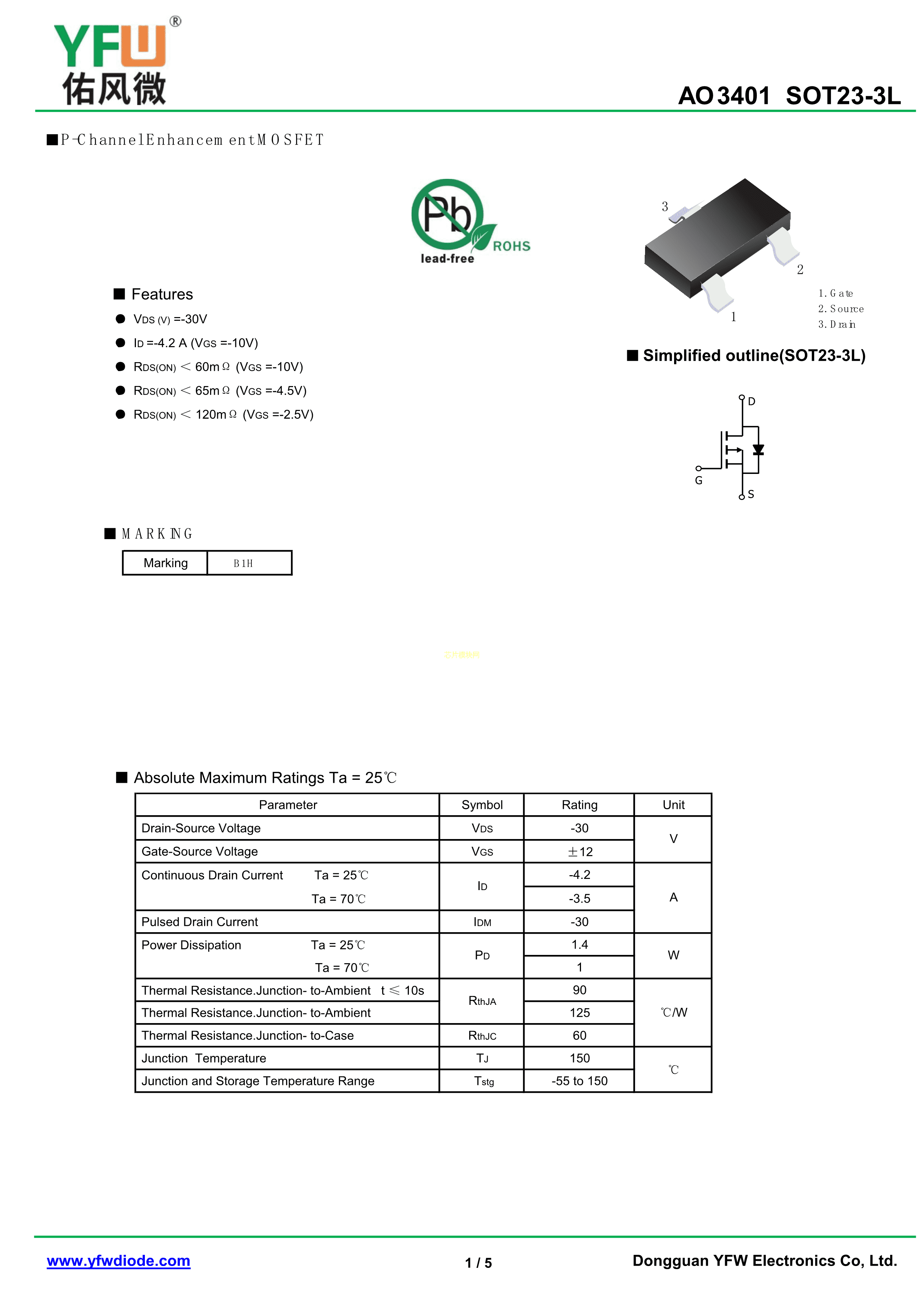 AO3401数据手册SOT-23-3L封装YFW(佑风微)PDF规格书,中英文下载